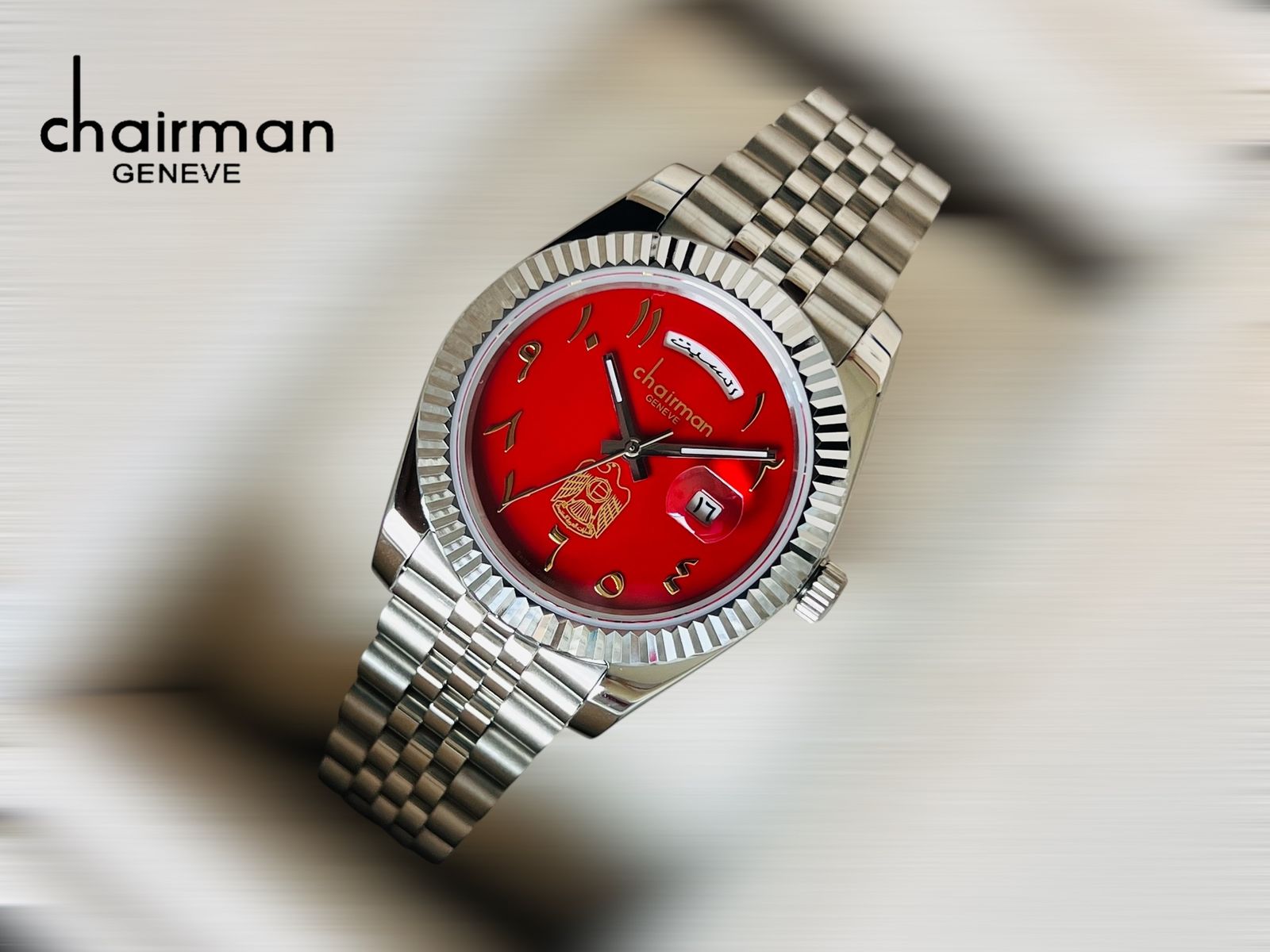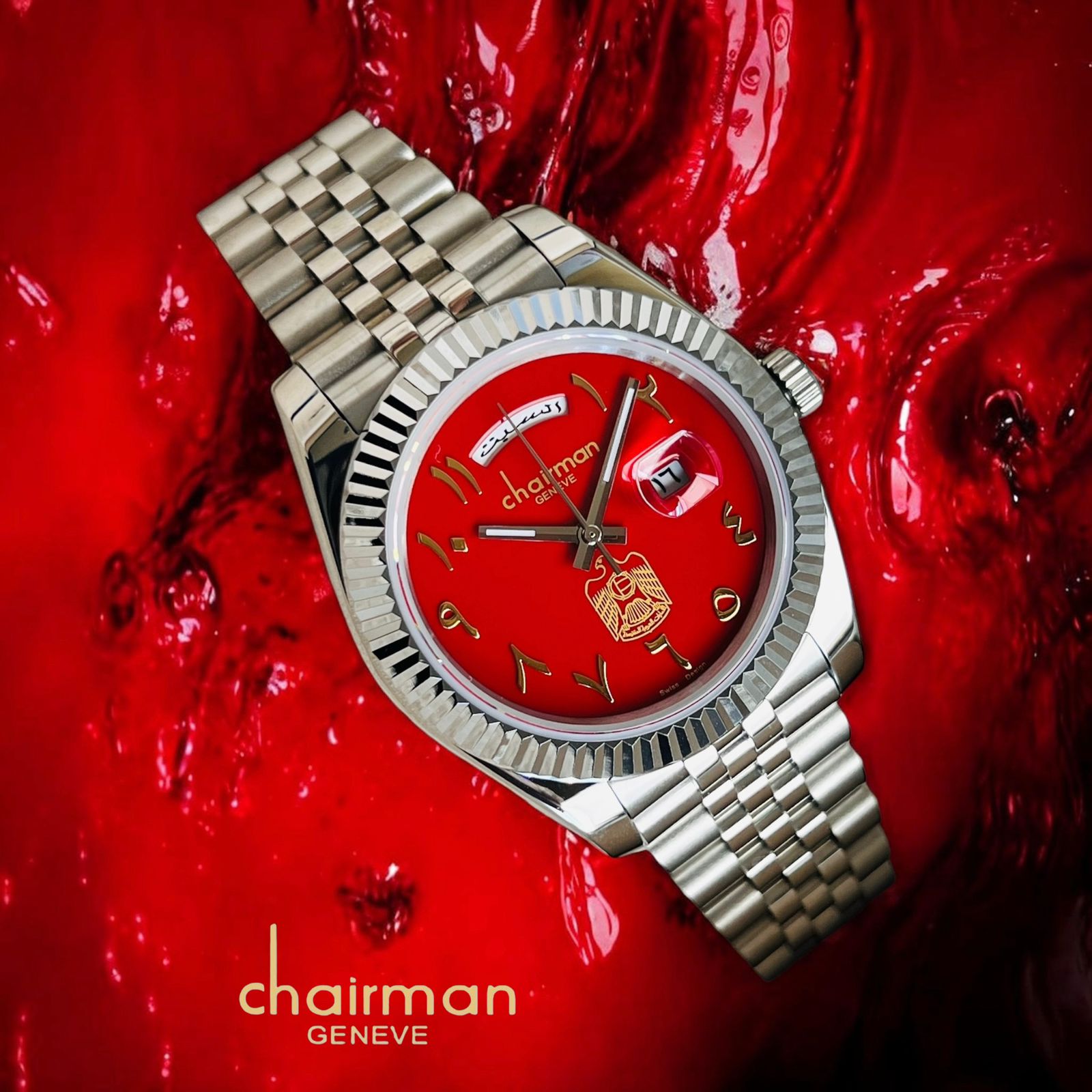 Chairman Geneve UAE Emblem Dated Red Dial Silver Chain Gents Watch