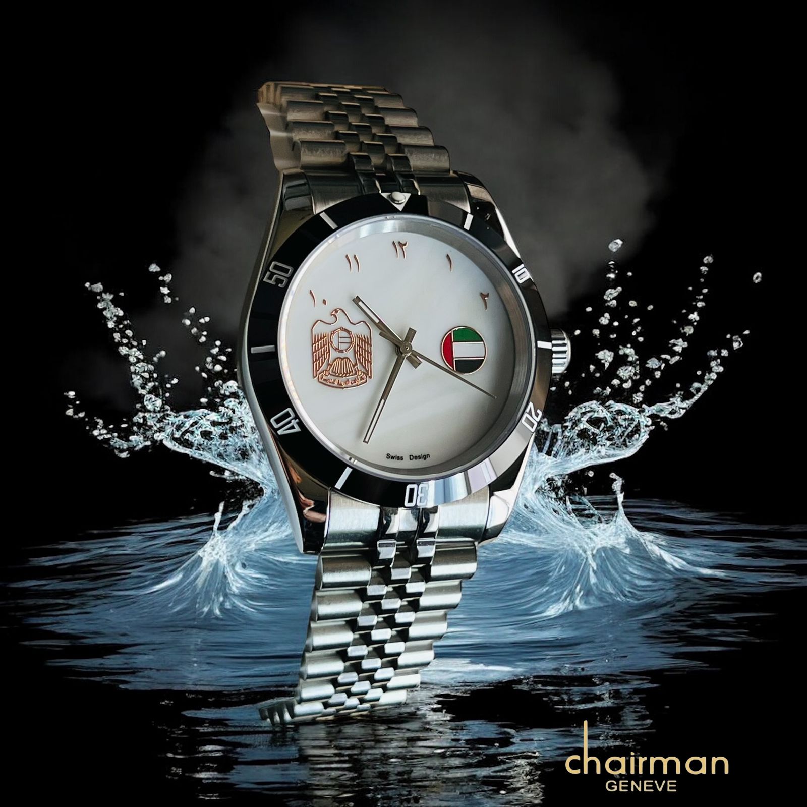 Celebrate national pride with this distinguished Chairman Geneve timepiece, expertly crafted for the modern gentleman. Featuring an elegant white dial adorned with authentic Arabic numerals and the prestigious UAE emblem, this watch seamlessly blends heritage with contemporary style. The polished silver chain bracelet adds a touch of sophistication, while precision engineering ensures reliable timekeeping for everyday wear or special occasions. A statement piece that honors tradition while making a bold impression on the wrist.