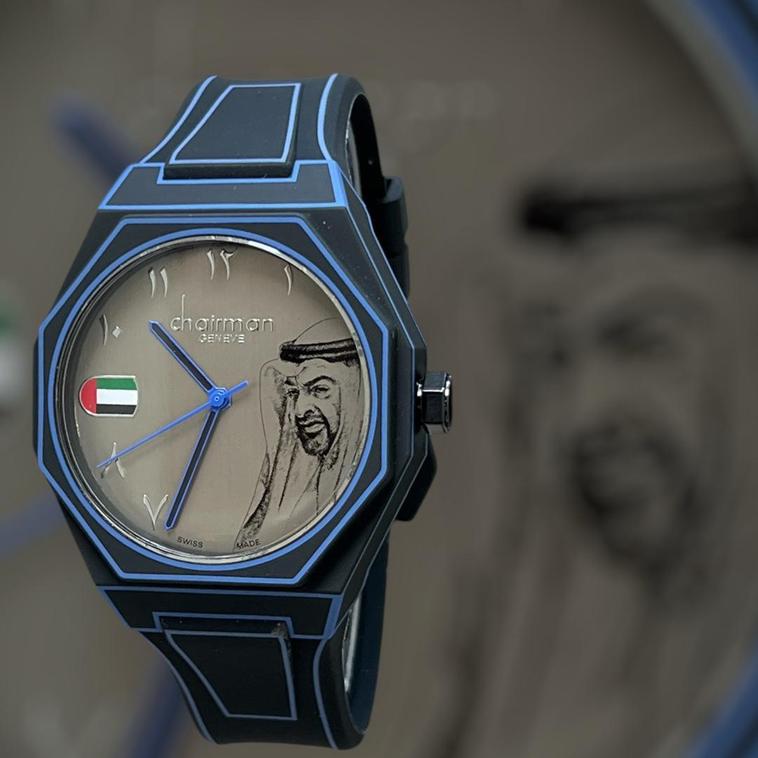 Elevate your wrist game with this exclusive Chairman Geneve timepiece featuring the UAE flag and Sheikh photo on an elegant grey Arabic dial. The striking blue poly carbon construction offers both durability and sophisticated style. A perfect statement piece that showcases national pride while delivering Swiss precision and craftsmanship. An essential accessory for the distinguished gentleman who appreciates luxury with patriotic significance.