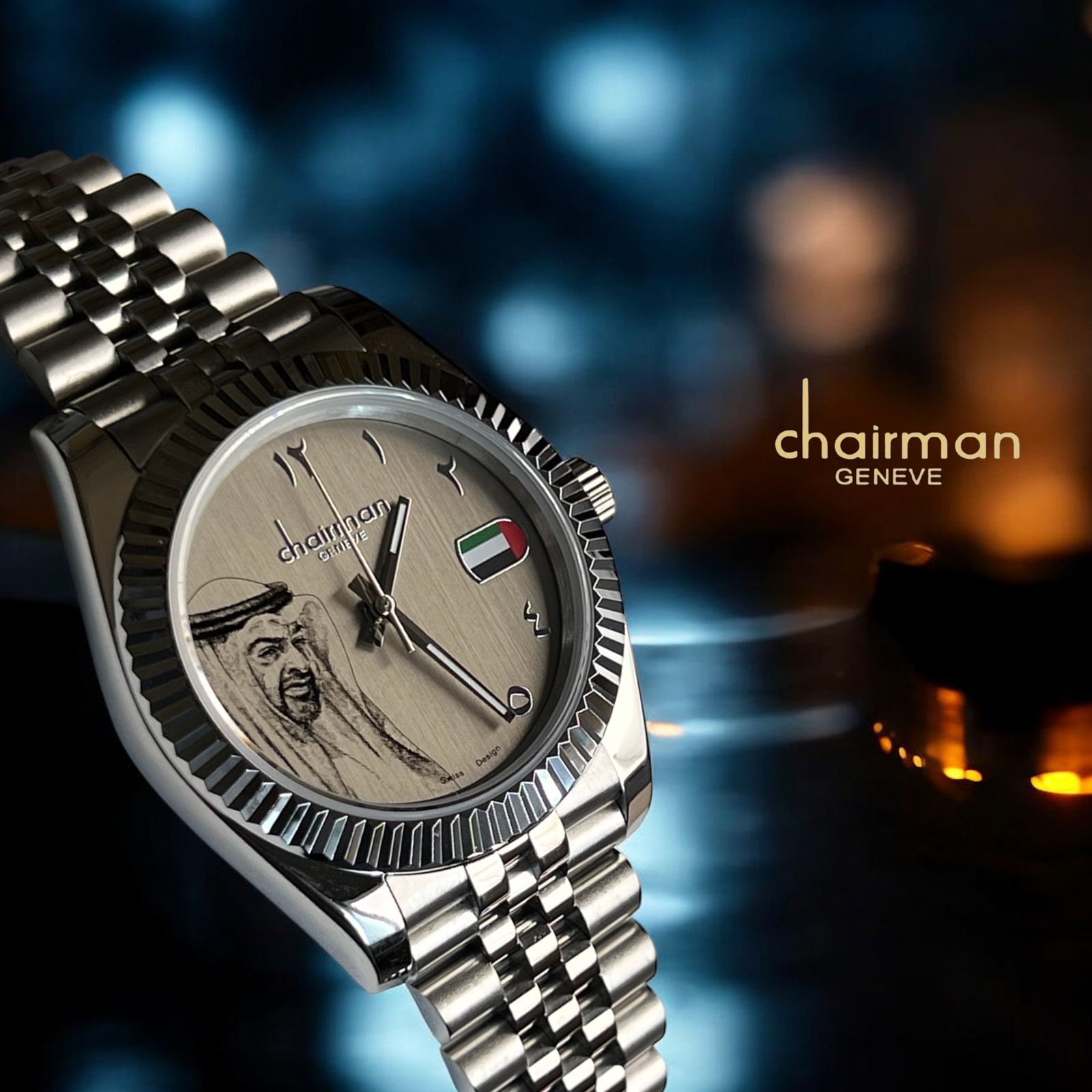 Elevate your wrist with this distinguished Chairman Geneve timepiece, crafted for the modern gentleman. Featuring an elegant grey dial paired with a gleaming silver chain, this watch seamlessly blends sophistication with cultural pride. The Arabic numerals and UAE Sheik flag design add a unique touch of heritage and prestige. Built with precision engineering, this gents watch is perfect for both formal occasions and everyday wear. Make a statement with timeless style and authentic craftsmanship.