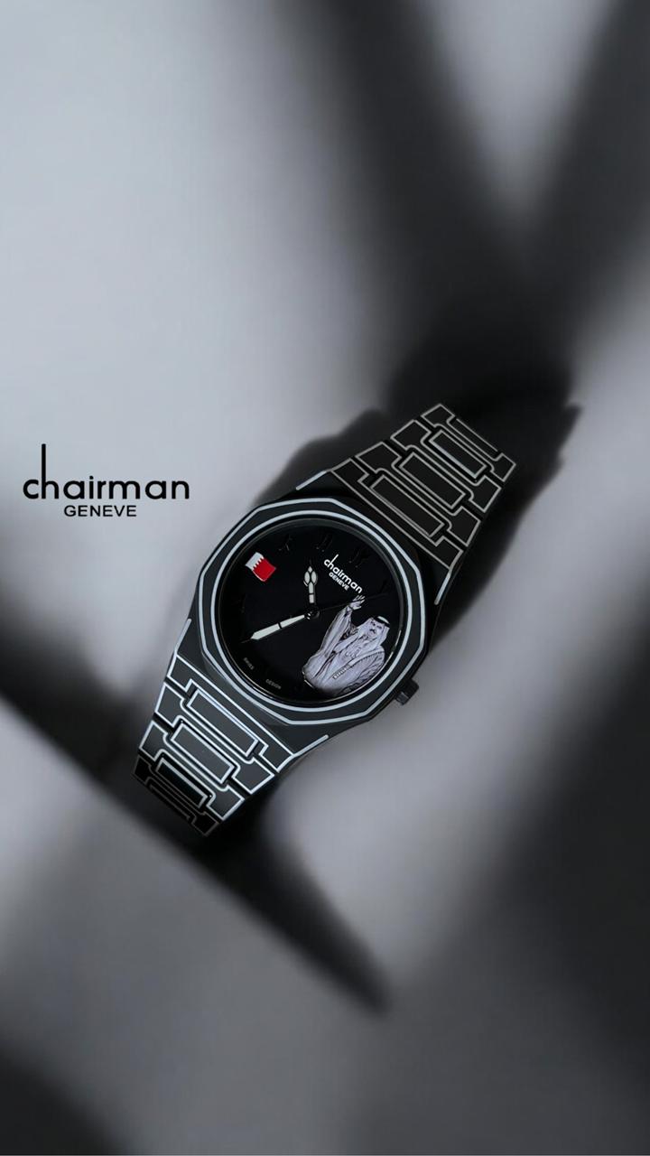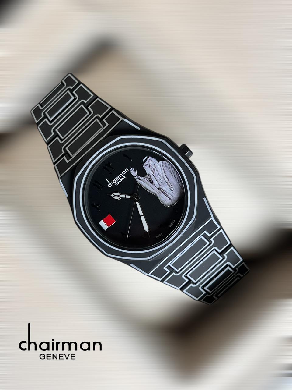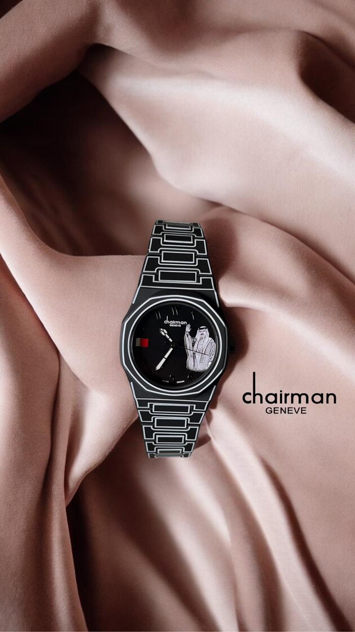 Elevate your wrist with this distinguished timepiece featuring the Emir of Qatar and national flag on a sleek black dial. Crafted with premium black poly carbon, the Chairman Geneve Gents Watch combines sophisticated design with precision engineering. A perfect statement piece that showcases both luxury and cultural significance for the discerning gentleman.
