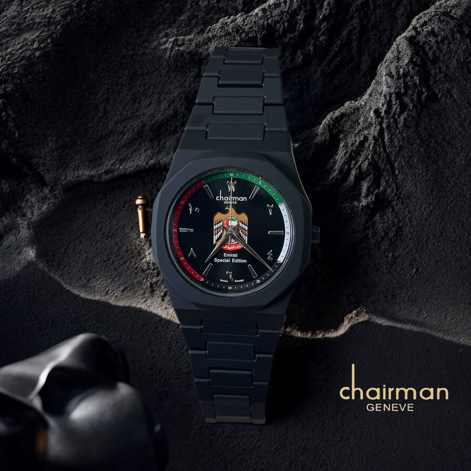 Experience timeless elegance with the Emirati Special Edition Chairman Geneve watch. Featuring a bold black dial with Arabic numerals and the distinguished UAE emblem, this timepiece reflects heritage and style. The sleek black strap ensures a comfortable fit for gents, making it perfect for both formal and casual occasions. Embrace luxury that honors tradition with every glance at this exclusive watch.