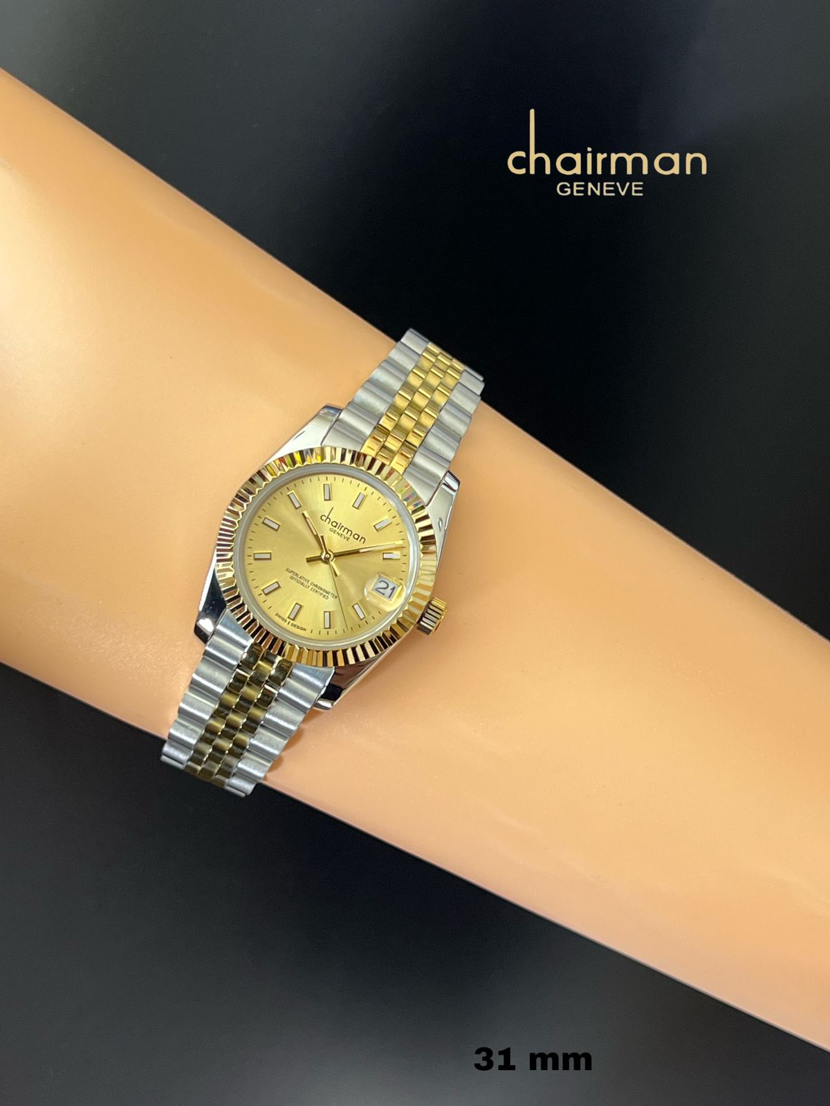 Experience timeless luxury with our Golden Dated Dial Chairman Geneve Silver Gold Chain Gents Watch. Its elegant golden dial, silver and gold chain, and precise timekeeping make it a perfect addition to any gentleman's collection. Be a true style icon with this classic timepiece. FREE DELIVERY CASH ON DELIVERY ALL OVER UAE
