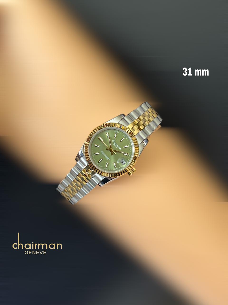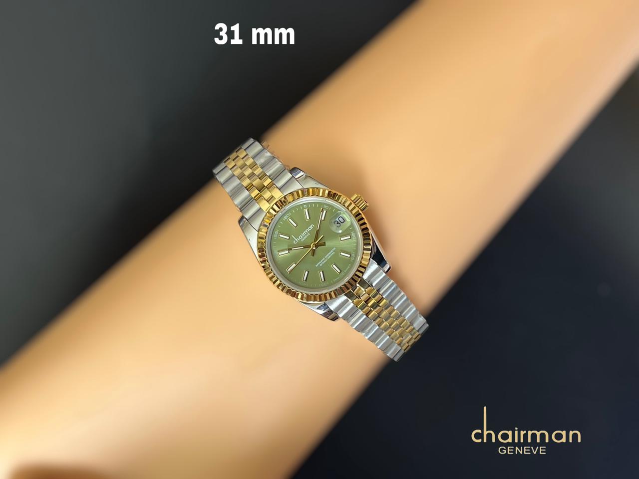 Elevate your style with the Green Dated Dial Gold Silver Strap Chairman Geneve Ladies Watch. This luxury timepiece features a striking green dial, accented by a sleek gold and silver strap. Keep track of time in style with this stunning watch. FREE DELIVERY CASH ON DELIVERY ALL OVER UAE