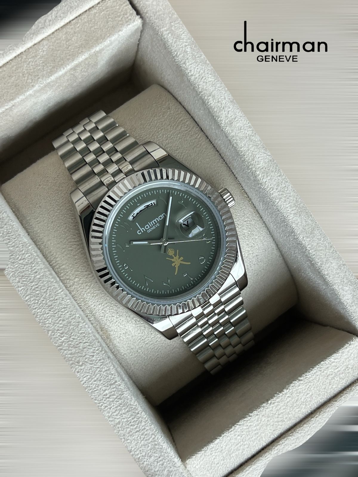 Elevate your style with our timeless Grey Dated Arabic Dial Chairman Geneve Silver Chain Gents Watch. This classic timepiece boasts a sleek, silver chain and a sophisticated grey dial with Arabic numerals. Stay punctual and on trend with this elegant watch.