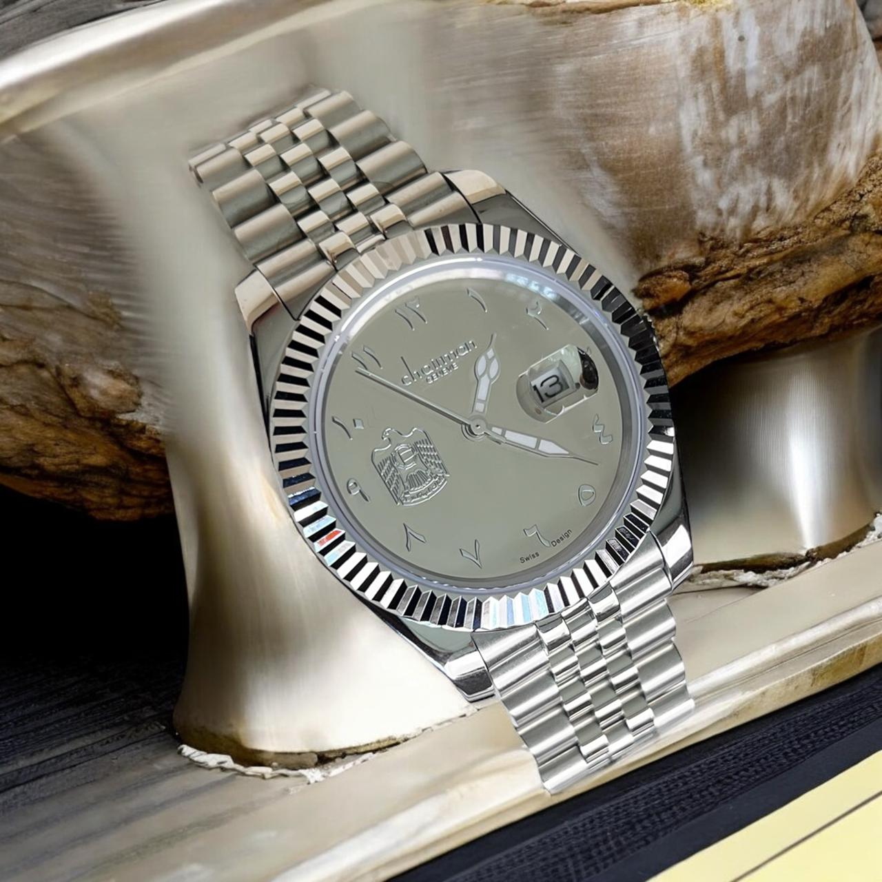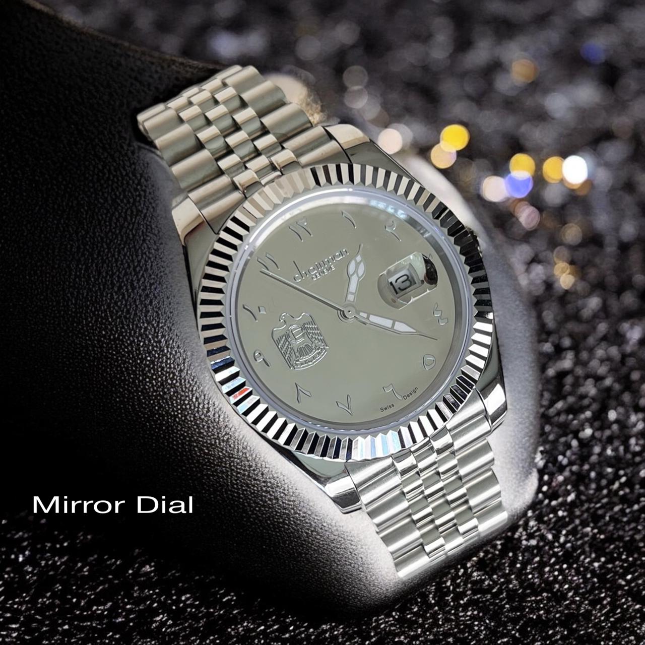 Mirror Dial Chairman Geneve UAE Emblem Dated Arabic Grey Dial Silver Chain Gents Watch