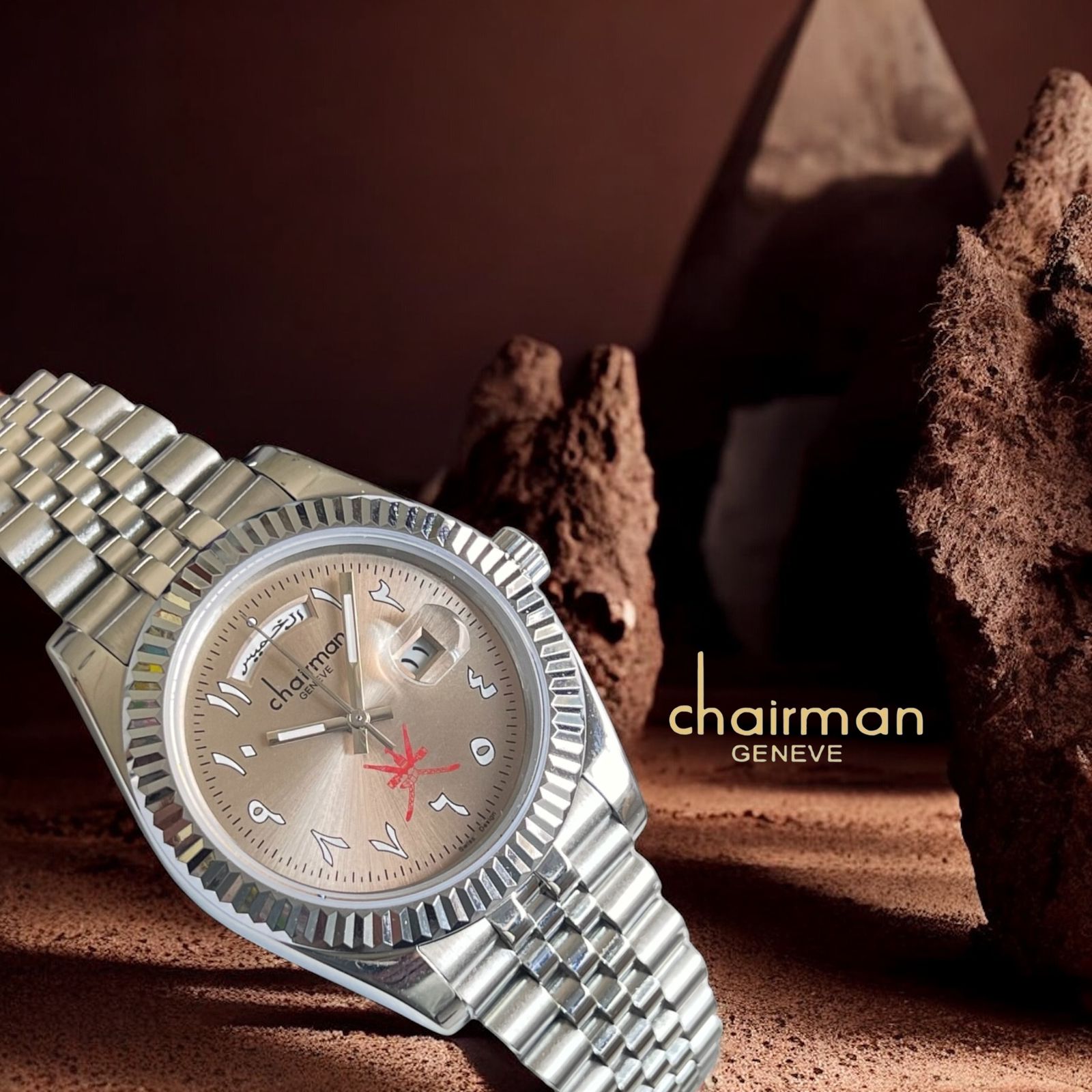 Elevate your wrist with the OMAN Emblem Chairman Geneve—a distinguished timepiece that blends heritage with sophistication. Featuring an elegant beige dial adorned with Arabic numerals and a date window, this gents watch exudes timeless charm. The polished silver chain bracelet complements the refined design, making it perfect for both formal occasions and everyday wear. Crafted with precision and attention to detail, this watch is a statement of elegance for the discerning gentleman who values quality and style.