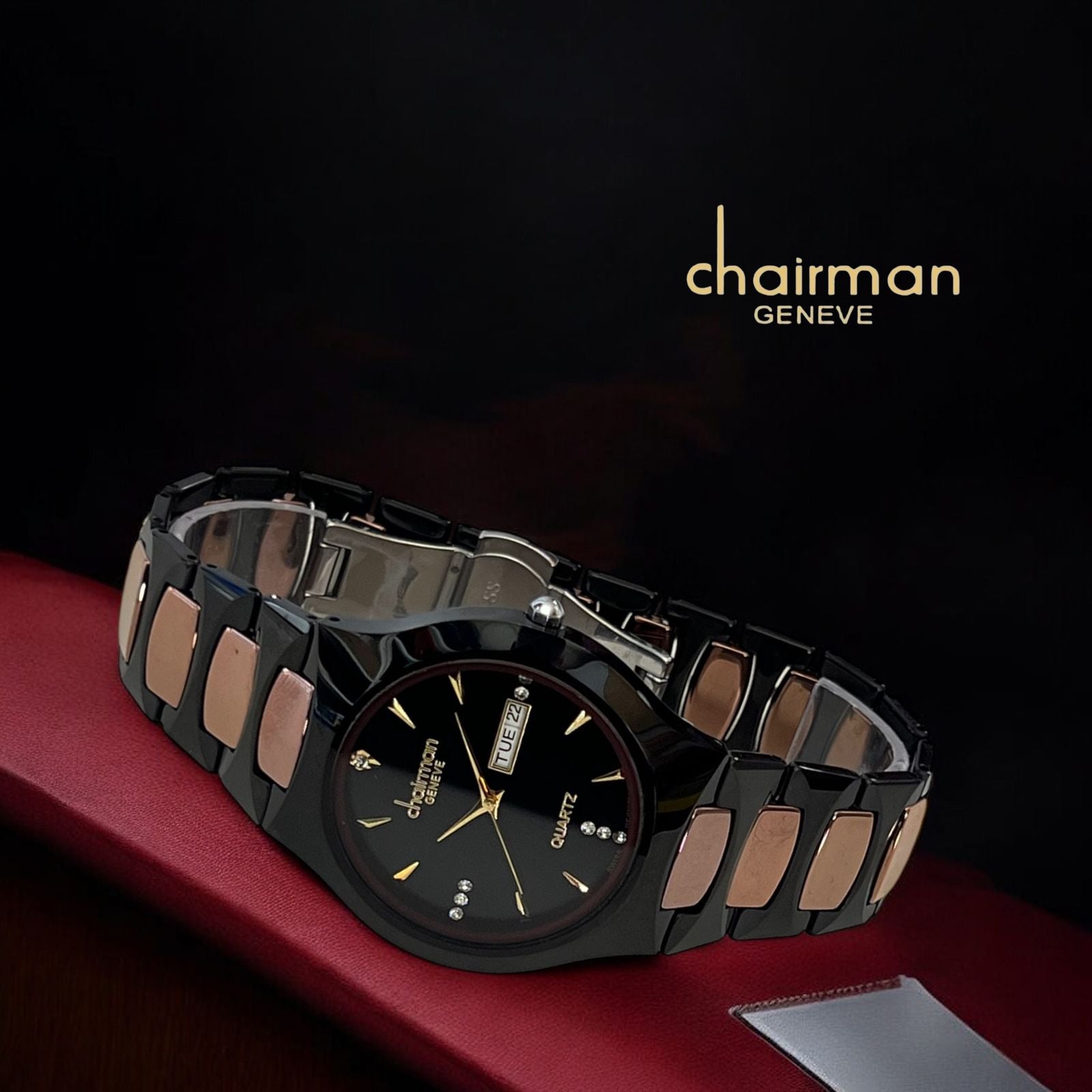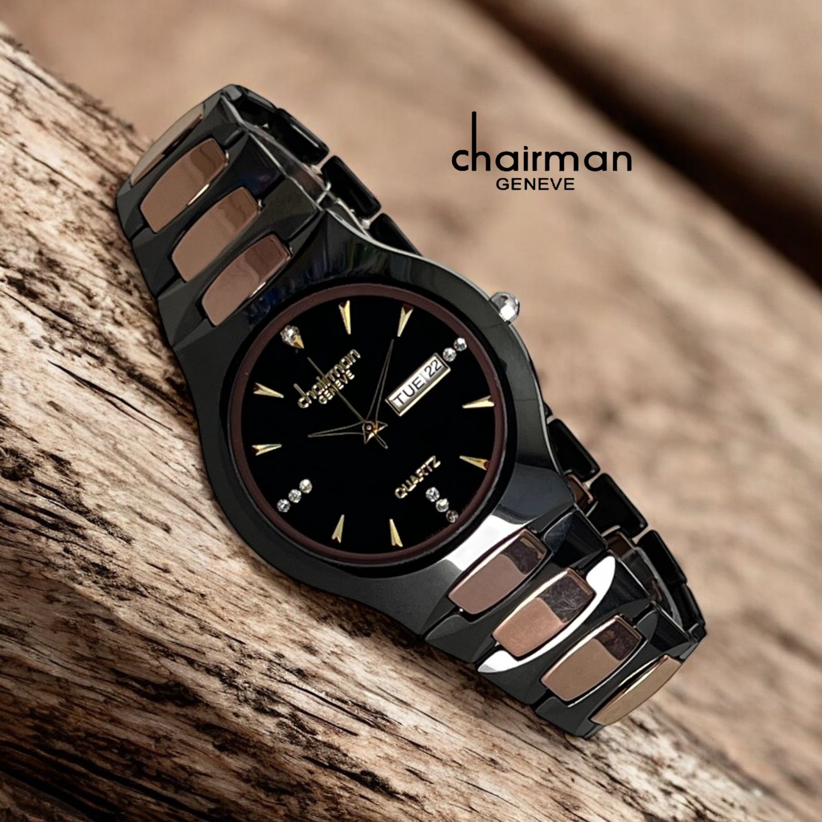 Experience timeless elegance with the Quartz Ceramic Chairman Geneve Ladies Watch, featuring a sleek black dial accented by a sophisticated black and beige chain bracelet. The day and date display adds practical functionality, while the durable ceramic build offers lasting comfort and style. Perfect for everyday wear or special occasions, this watch combines classic design with modern convenience to complement your refined taste.