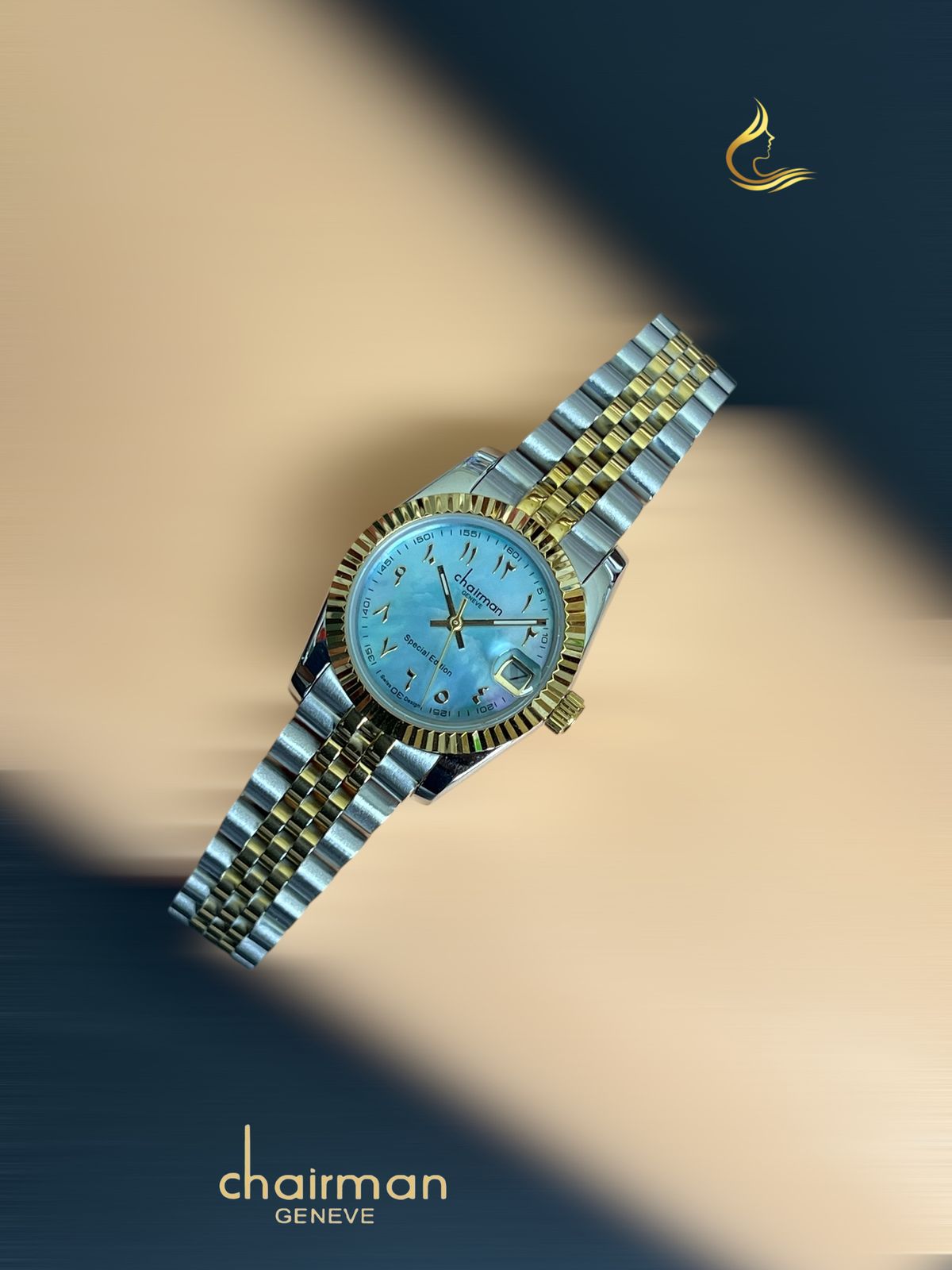 Introducing our Sky Blue Arabic Dated Dial Silver And Gold Chairman Geneve Ladies Watch. This elegant timepiece combines a striking sky blue dial with silver and gold accents for a refined and luxurious look. Stay on schedule in style with this Chairman Geneve watch.
