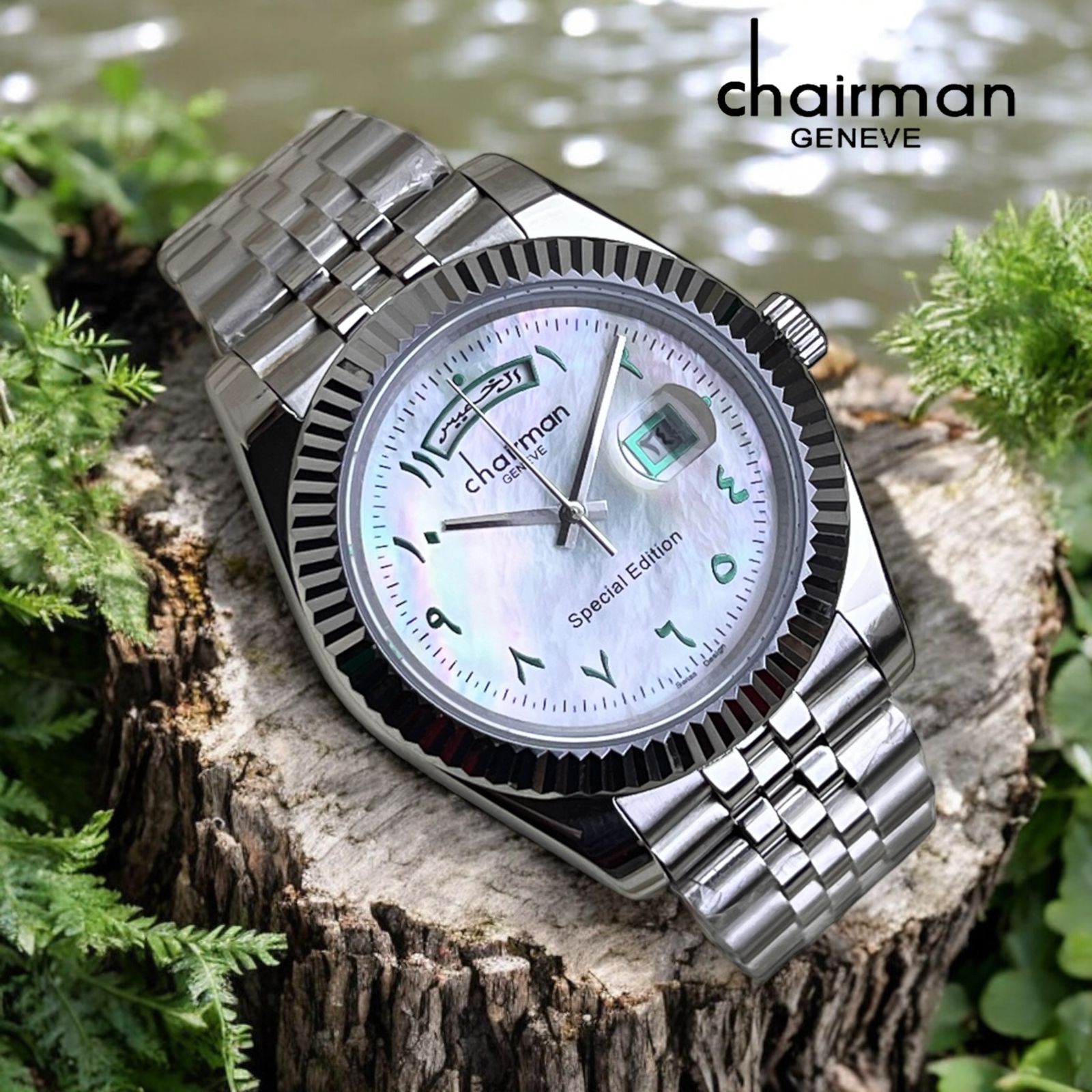 Introducing the Special Edition Chairman Arabic Dial Pearl White Silver Chain. Elevate your style with this luxurious watch featuring a unique Arabic dial, crafted with high-quality materials for a sophisticated look. Perfect for any occasion, this watch is a must-have for any fashion-forward individual.