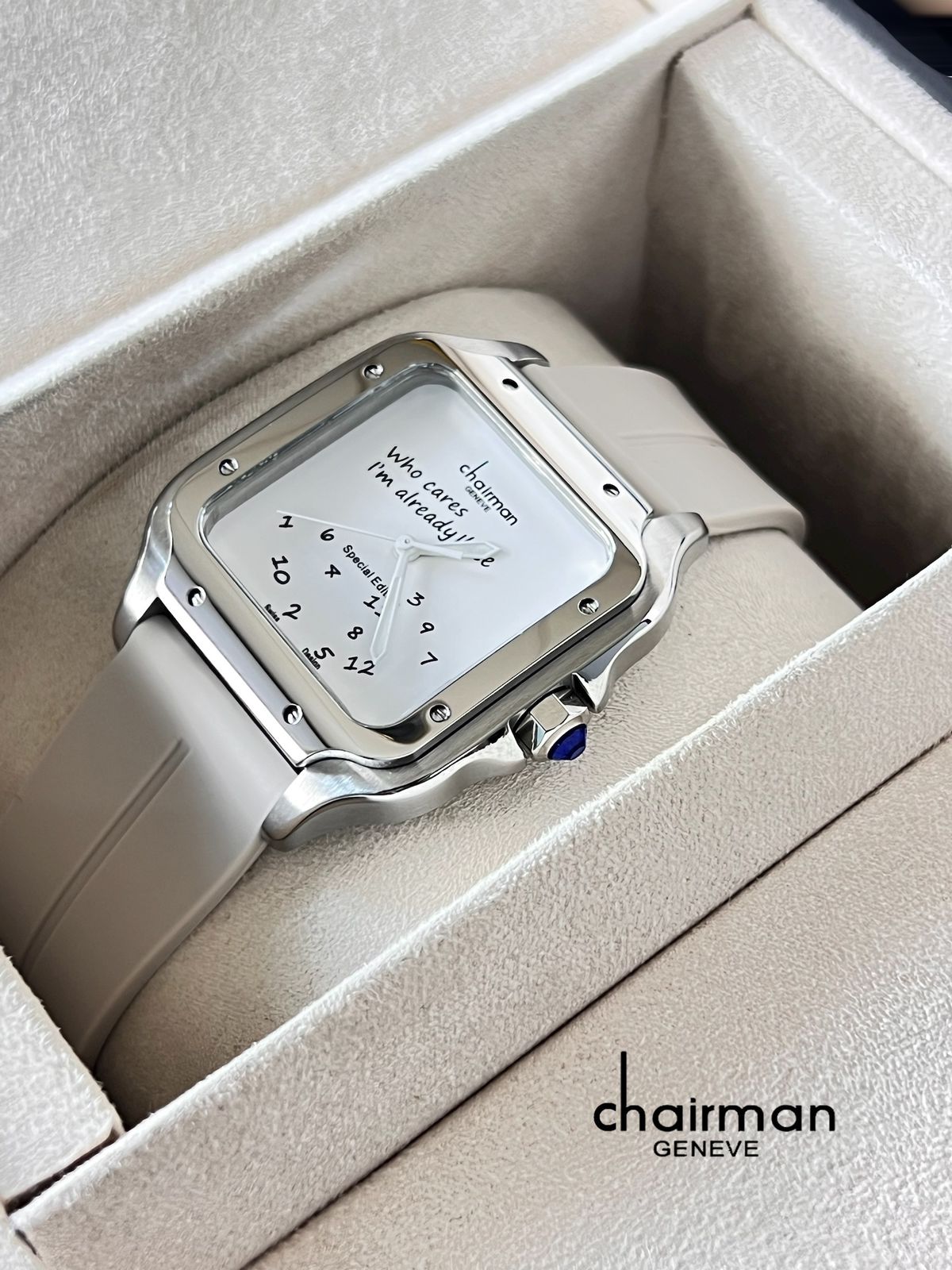 Elevate your wrist with timeless sophistication. The Special Edition Chairman Geneve features a pristine white dial that captures light beautifully, paired with a refined baby grey strap for understated elegance. Crafted for the discerning gentleman, this timepiece blends classic Swiss-inspired design with contemporary style. Perfect for boardrooms, formal occasions, or everyday wear, it's a statement of refined taste and enduring quality. A watch that speaks volumes without saying a word.