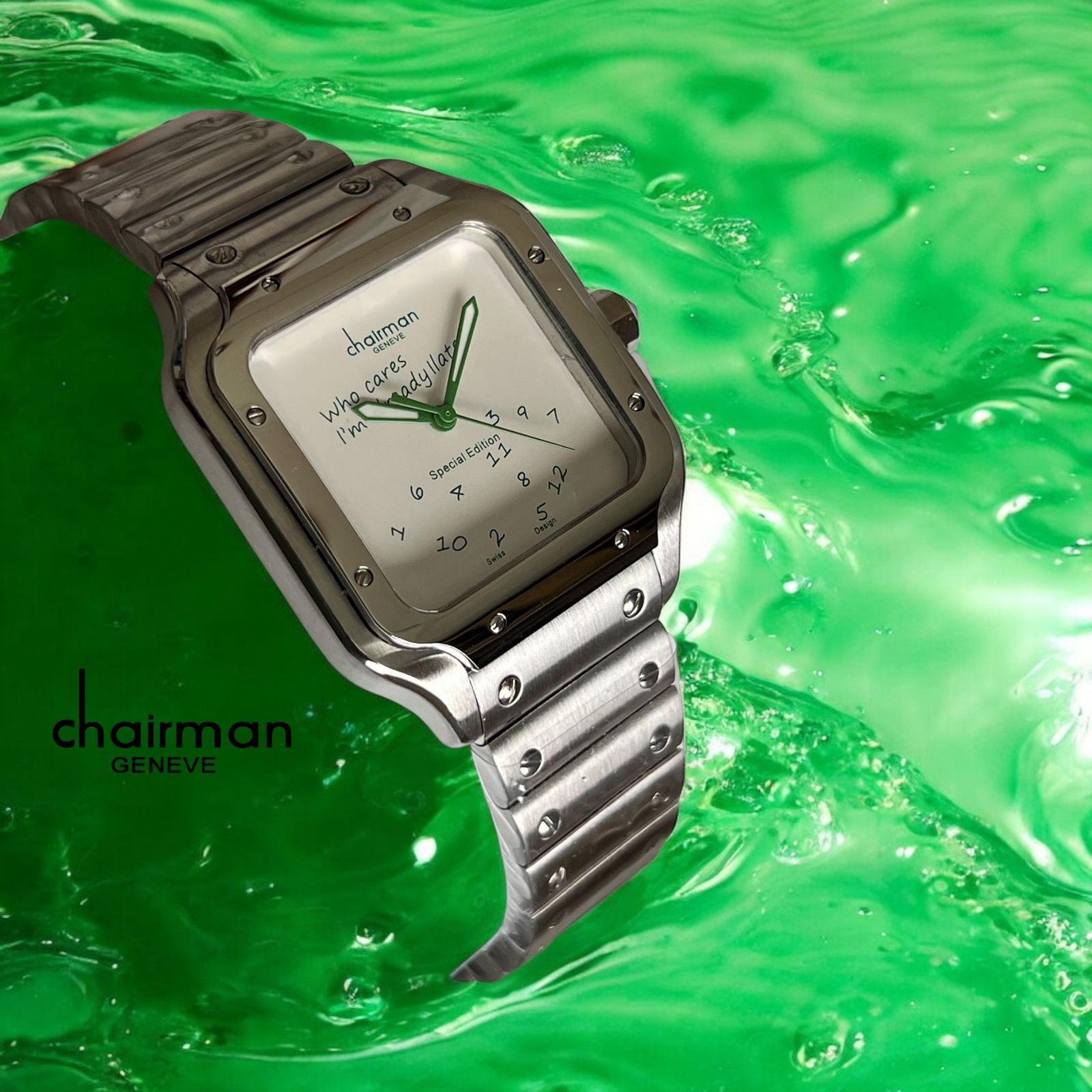 Elevate your style with the Special Edition Chairman Geneve watch, featuring a crisp white dial accented by striking green letters. Its sleek silver chain adds a touch of sophistication, making it the perfect accessory for the modern gentleman. Designed for both elegance and durability, this timepiece complements any outfit while ensuring reliable timekeeping. Make a bold statement with this exclusive gents watch that blends classic charm with contemporary flair.