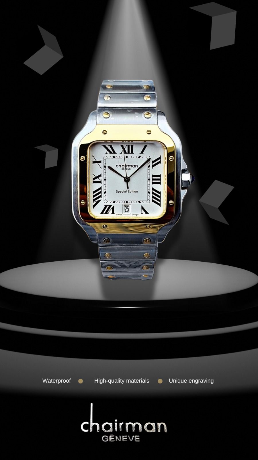 Elevate your style with the Square White Dial Chairman Geneve Silver Gold Strap Watch. This luxurious timepiece boasts a sleek square white dial and a classic silver and gold strap that exudes elegance and sophistication. Complete any outfit with this statement piece that is perfect for any occasion.