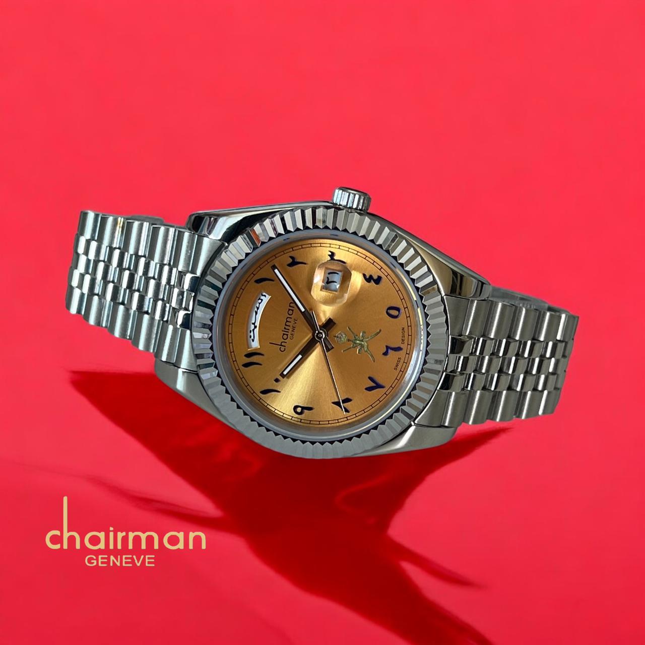 Elevate your style with our Swiss Design Chairman watch. Featuring an orange dial, silver chain, and day and date display, this watch adds a touch of sophistication to any outfit. Keep track of your days and look effortlessly classy with this statement piece.