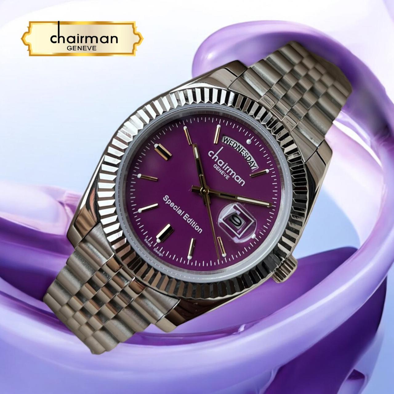 Elevate your style with the Swiss Design Chairman Geneve watch, featuring a striking purple dial and precise day and date display. Crafted for gentlemen, its silver chain bracelet offers both durability and elegance, making it the perfect accessory for any occasion. Experience Swiss craftsmanship combined with timeless sophistication.