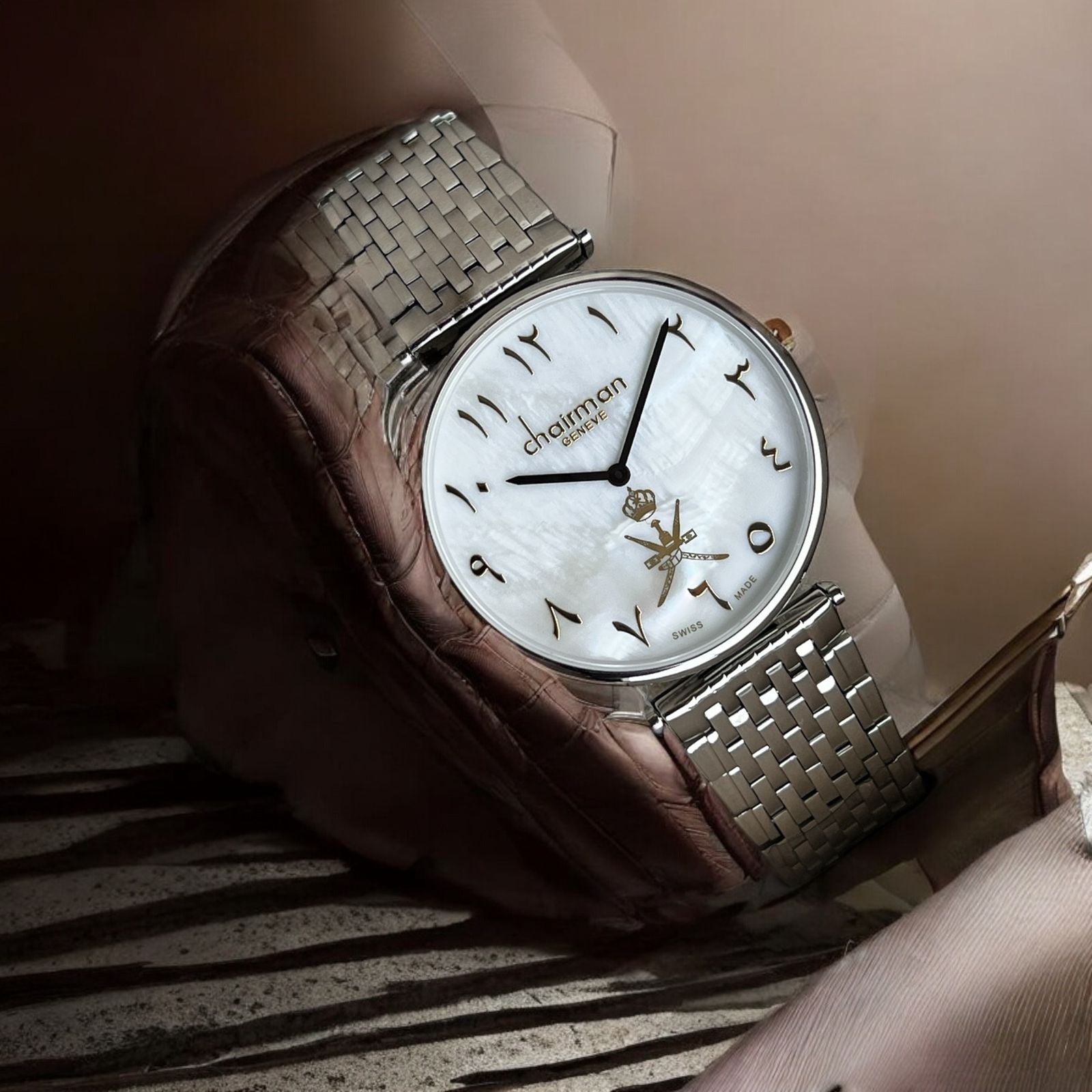 Experience timeless elegance with the Swiss Made Chairman Geneve watch, featuring the distinguished OMAN emblem on a striking white marble dial. Crafted for gentlemen, its silver chain adds a refined touch, blending luxury with cultural pride. This watch combines precision Swiss craftsmanship with a unique design, making it a perfect accessory for those who appreciate sophistication and heritage.