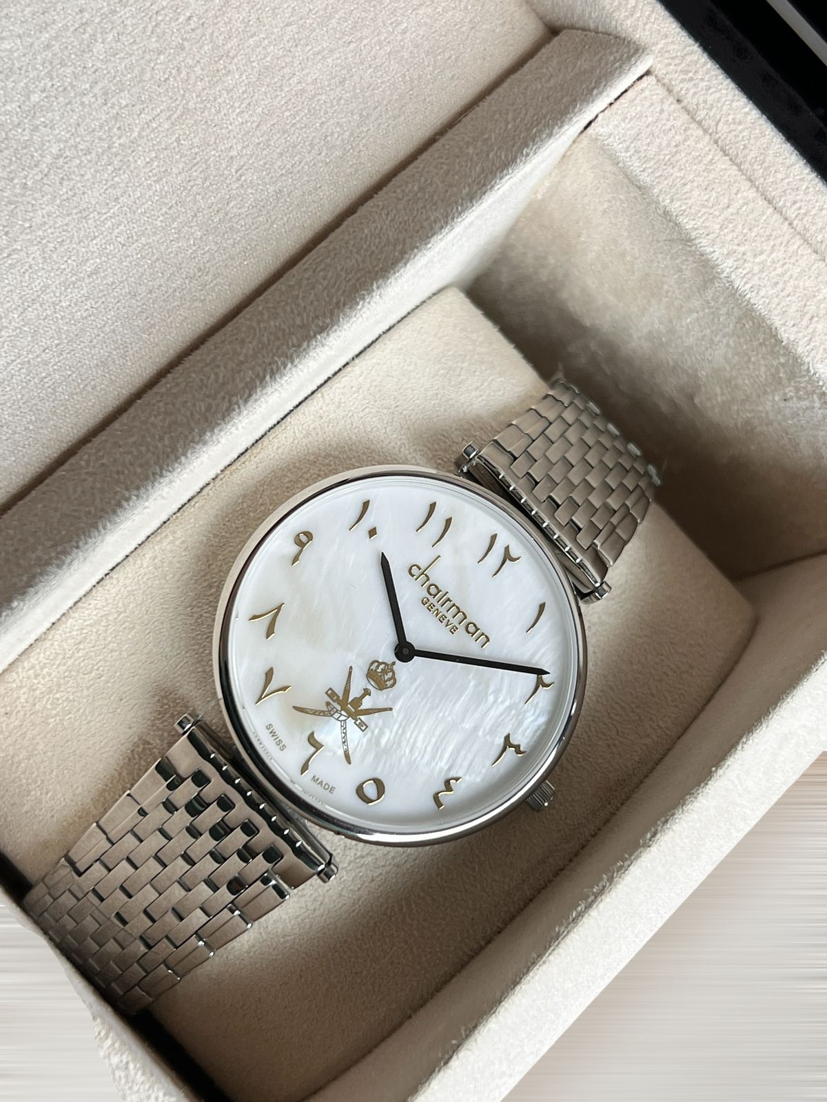 Swiss Made Chairman Geneve OMAN Emblem Arabic White Marble Dial Silver Chain Gents Watch
