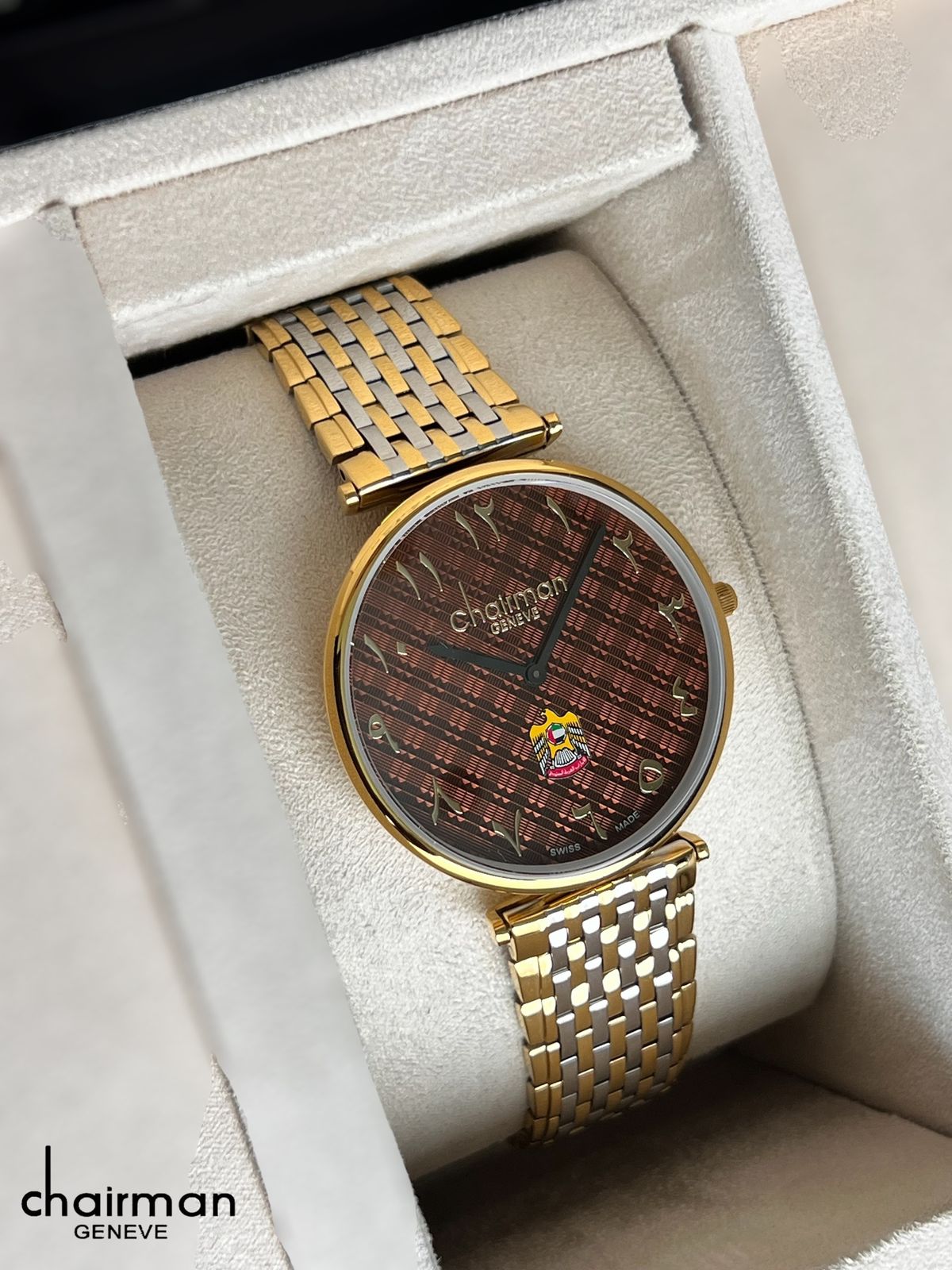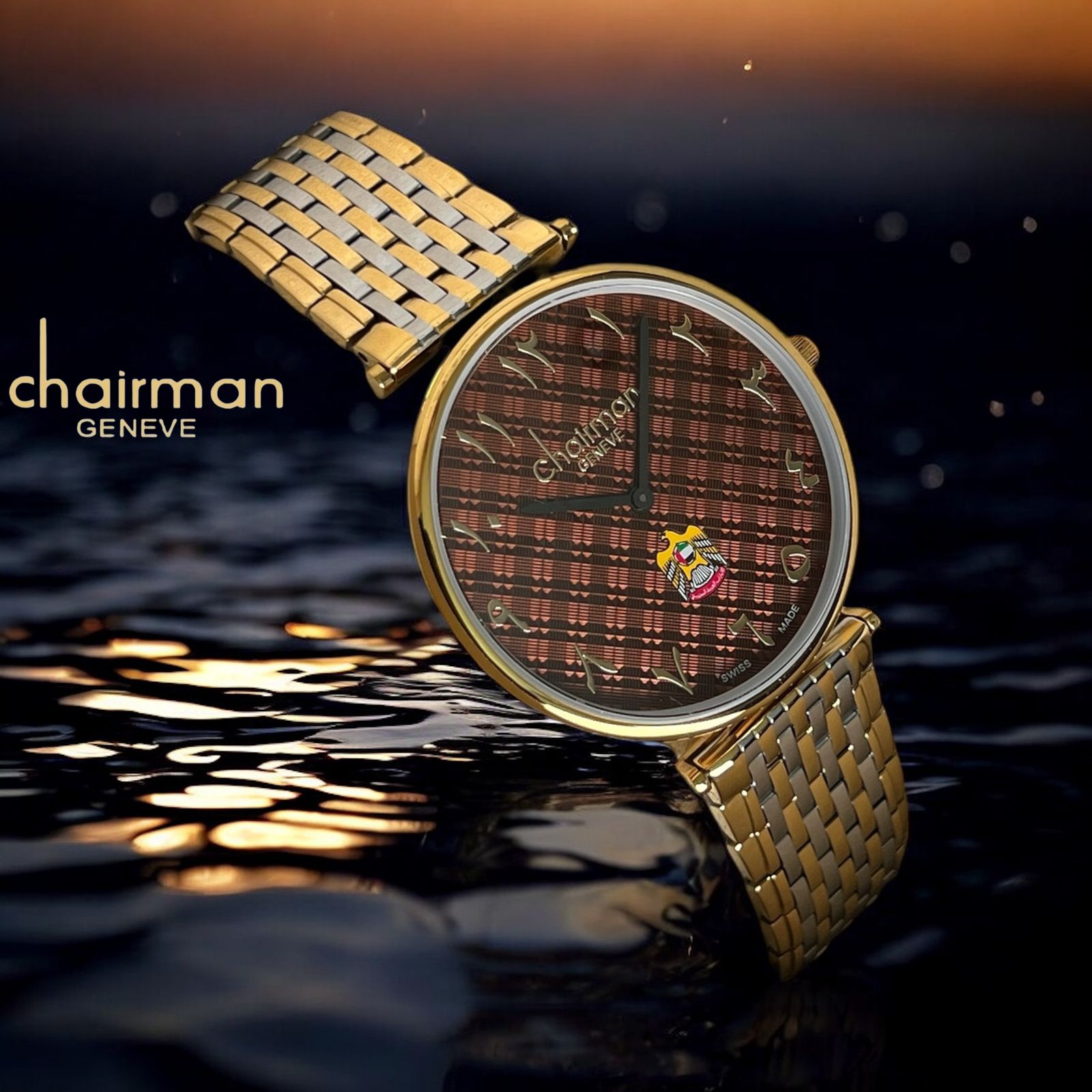 Experience timeless elegance with the Swiss Made Chairman Geneve Gents Watch, featuring a distinctive UAE emblem and an Arabic brown check dial. Its sophisticated silver and gold chain complements the refined design, making it perfect for formal occasions or daily wear. Crafted with Swiss precision, this watch combines heritage and style for a standout accessory that reflects both luxury and cultural pride.