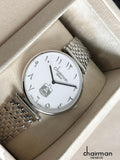 Elevate your style with the Swiss Made Chairman Geneve Gents Watch, featuring a distinctive UAE emblem on a crisp white dial with elegant Arabic numerals. The sleek silver chain complements the sophisticated design, combining timeless craftsmanship with cultural pride. Perfect for the discerning gentleman seeking a blend of heritage and modern luxury.