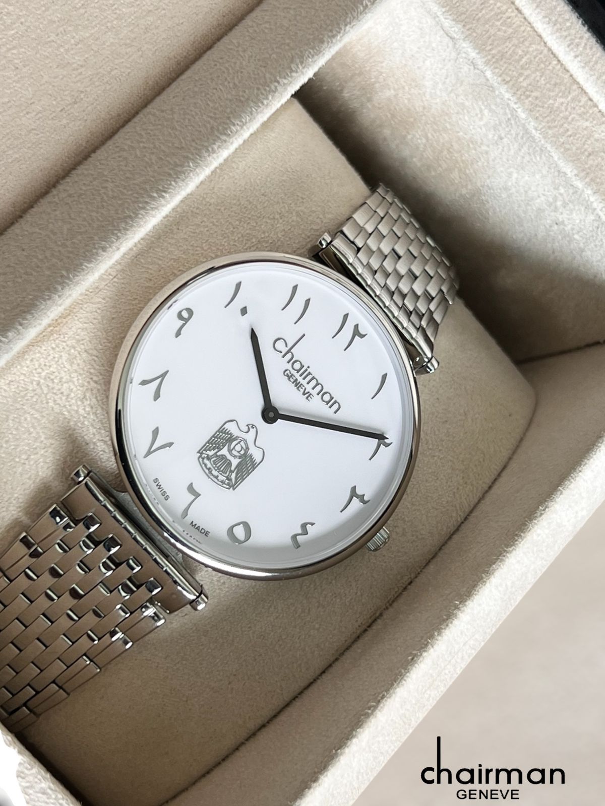 Swiss Made Chairman Geneve UAE Emblem Arabic White Dial Silver Chain Gents Watch