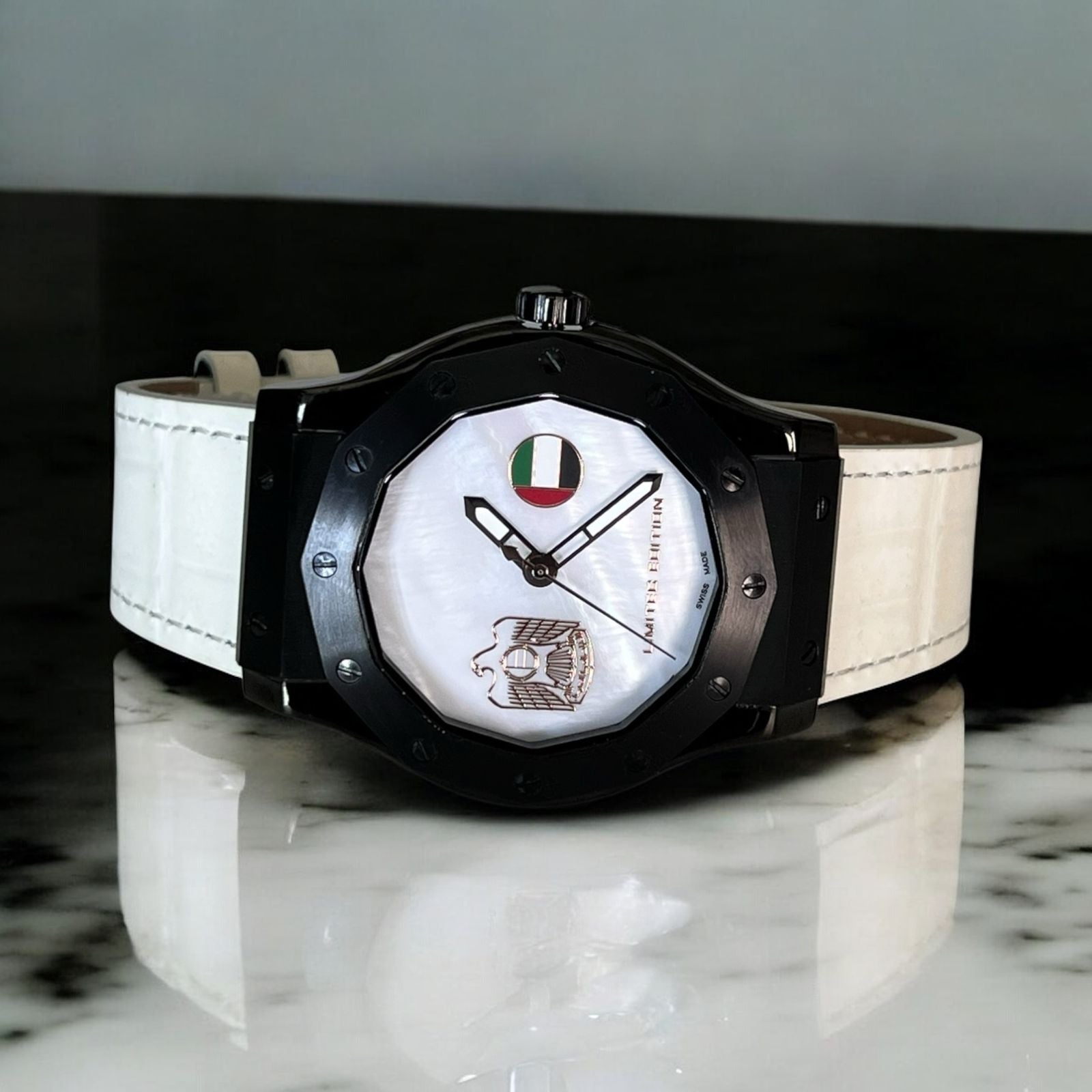 Elevate your style with the Swiss Made Chairman Geneve Gents Watch, featuring a pristine white dial and a distinctive UAE emblem flag design. Paired with a soft creme strap, this timepiece blends classic elegance with national pride. Crafted for reliability and sophistication, it’s the perfect accessory for the modern gentleman seeking timeless quality and unique character.