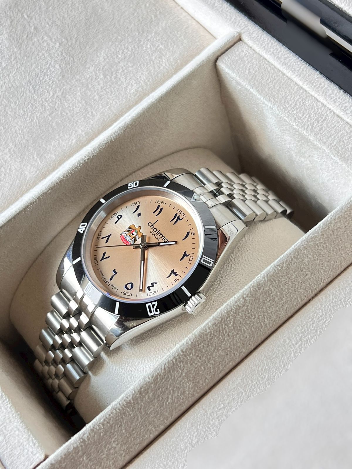 Elevate your wrist with the UAE Emblem Chairman Geneve—a distinguished timepiece that blends heritage with contemporary elegance. Featuring an eye-catching baby orange dial paired with Arabic numerals, this gents watch celebrates Emirati pride in style. The polished silver chain bracelet adds a touch of sophistication, while the precision Geneve movement ensures reliable timekeeping. Perfect for those who appreciate cultural significance and refined craftsmanship, this watch makes a bold statement for any occasion.