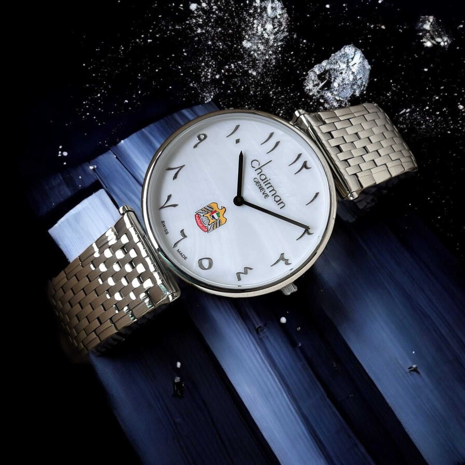 UAE Emblem Chairman Geneve Arabic White Dial Silver Chain Gents Watch