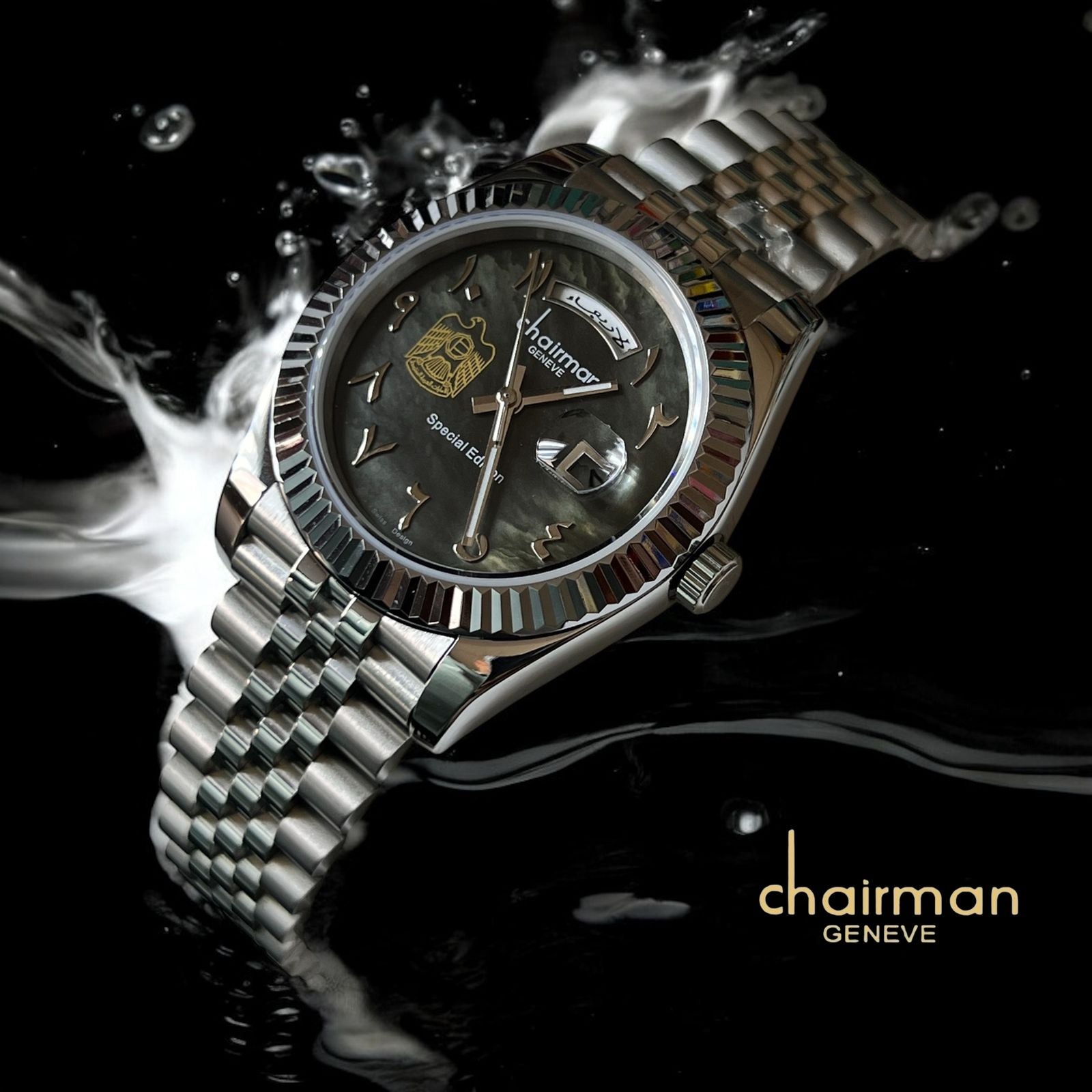 UAE Emblem Chairman Geneve Dated Arabic Grey Dial Silver Chain Gents Watch