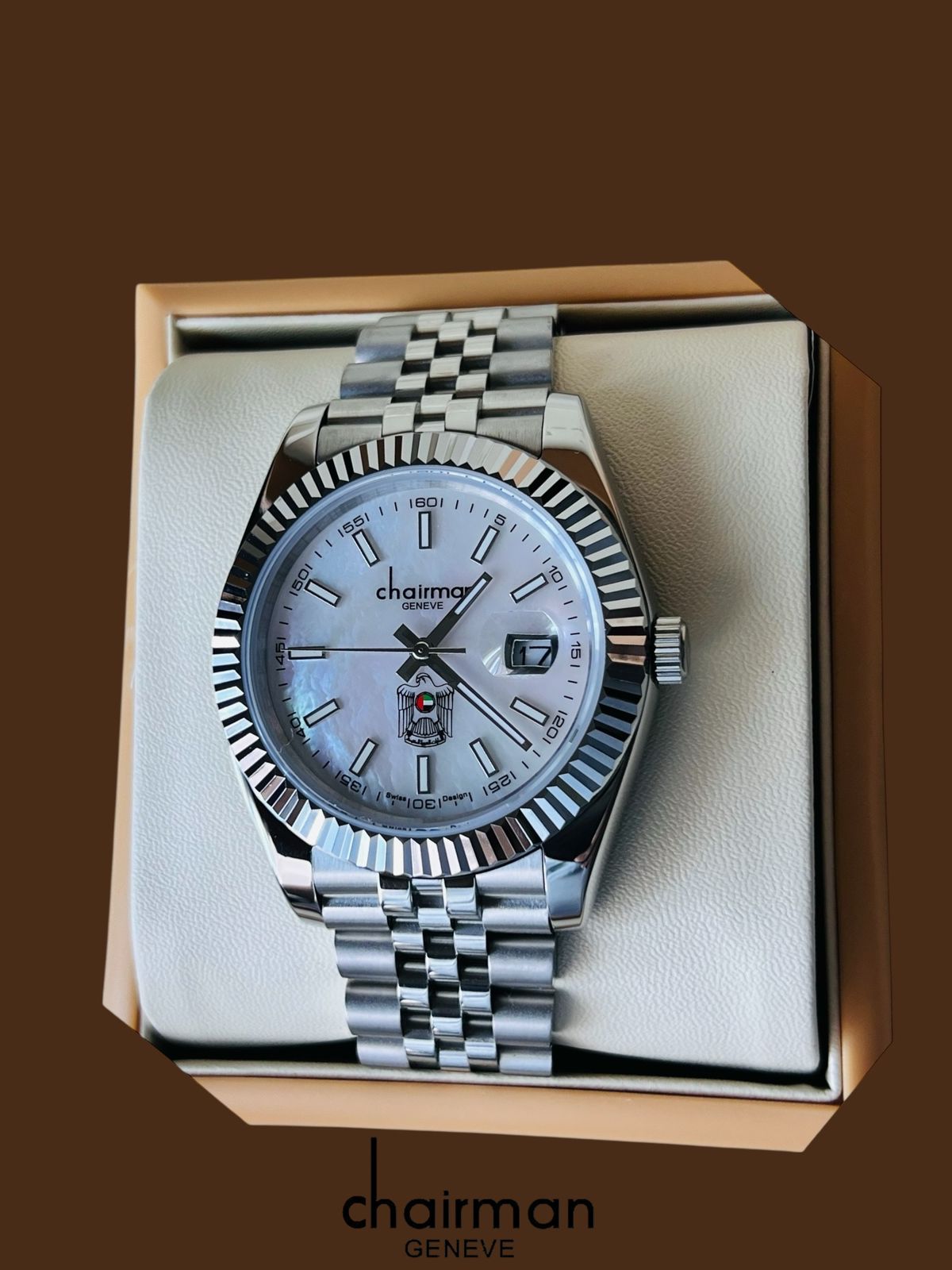 UAE Emblem Chairman Geneve Dated White Dial Silver Chain Gents Watch