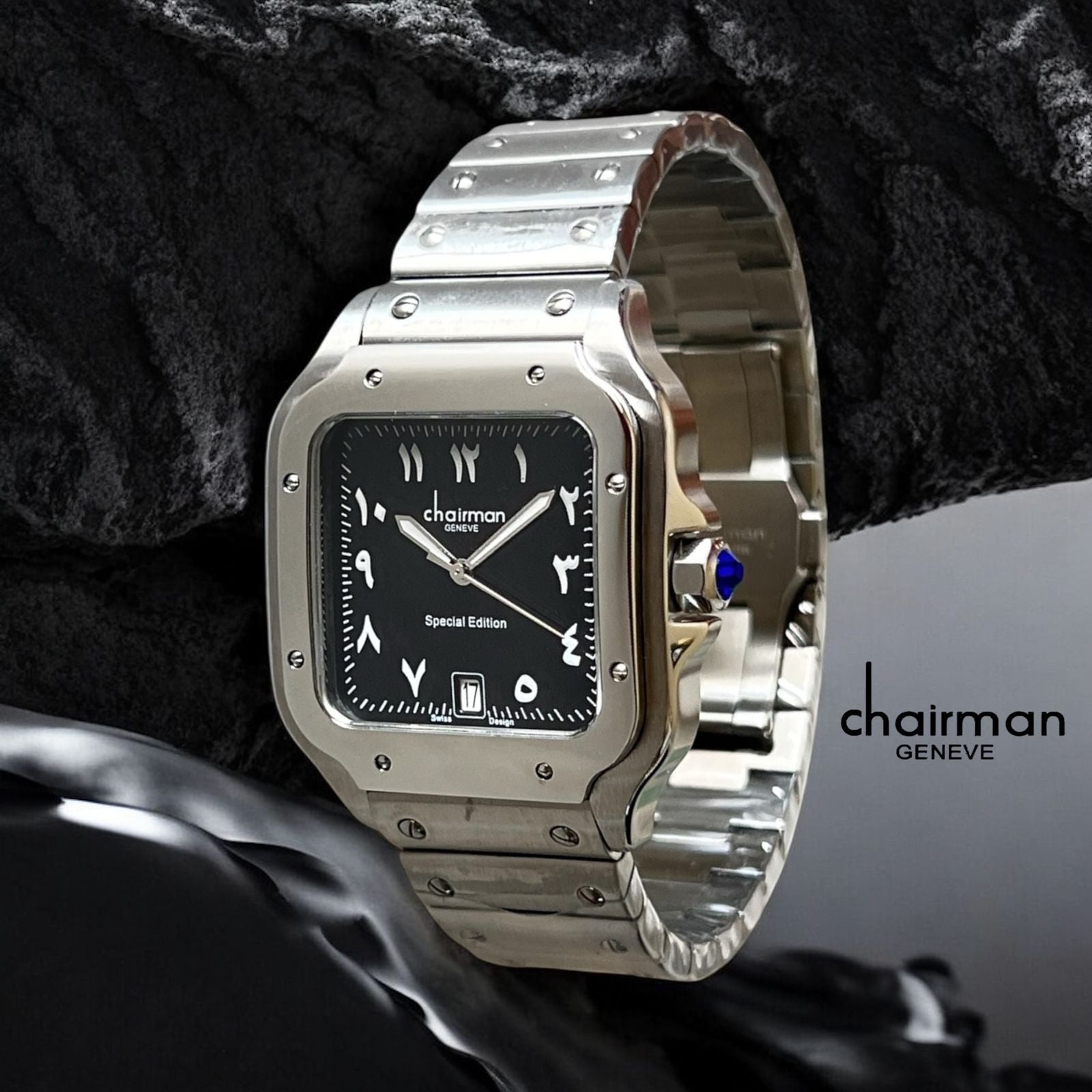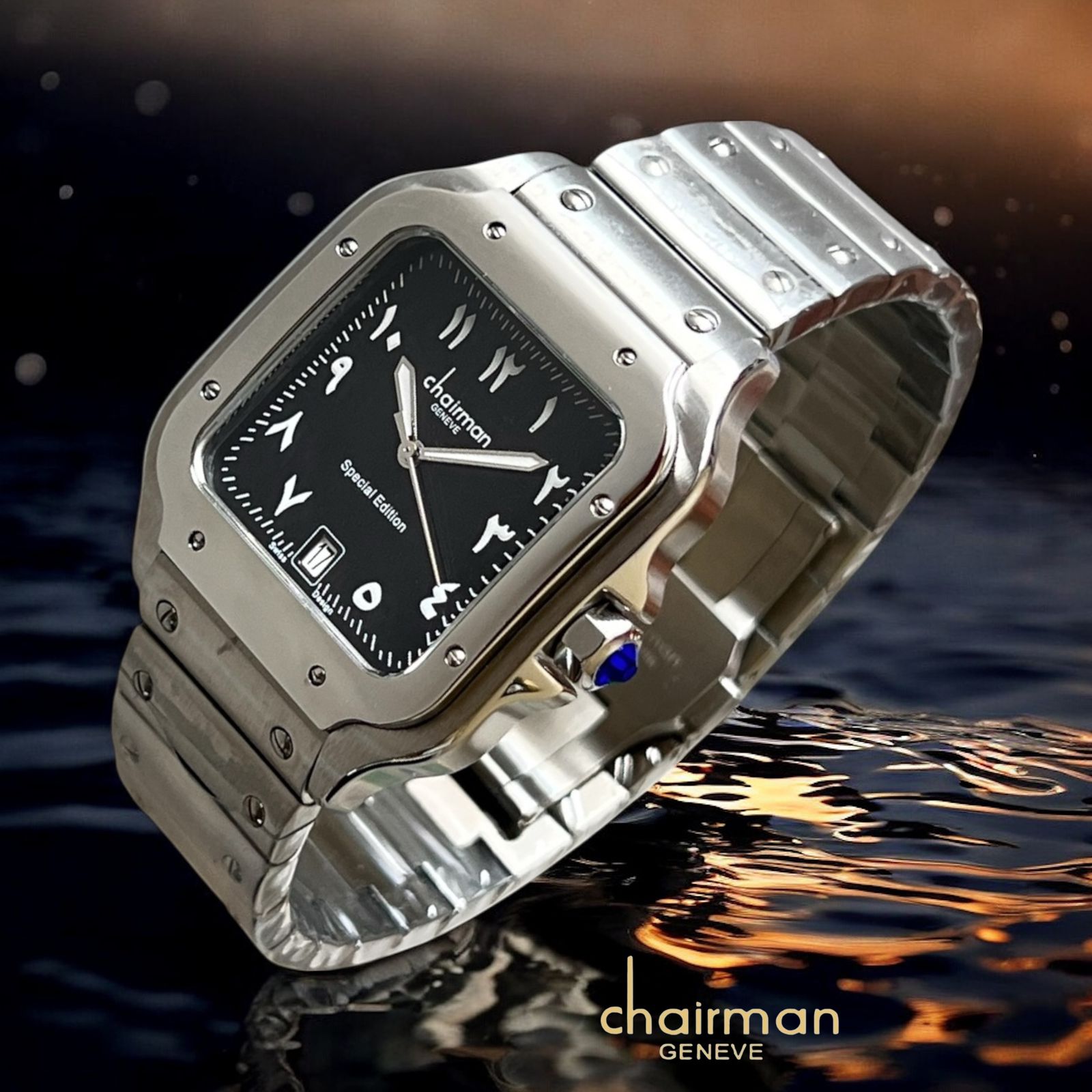 UAE Emblem Special Edition Chairman Geneve Arabic Dated Black Dial Silver Chain Gents Watch