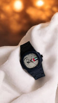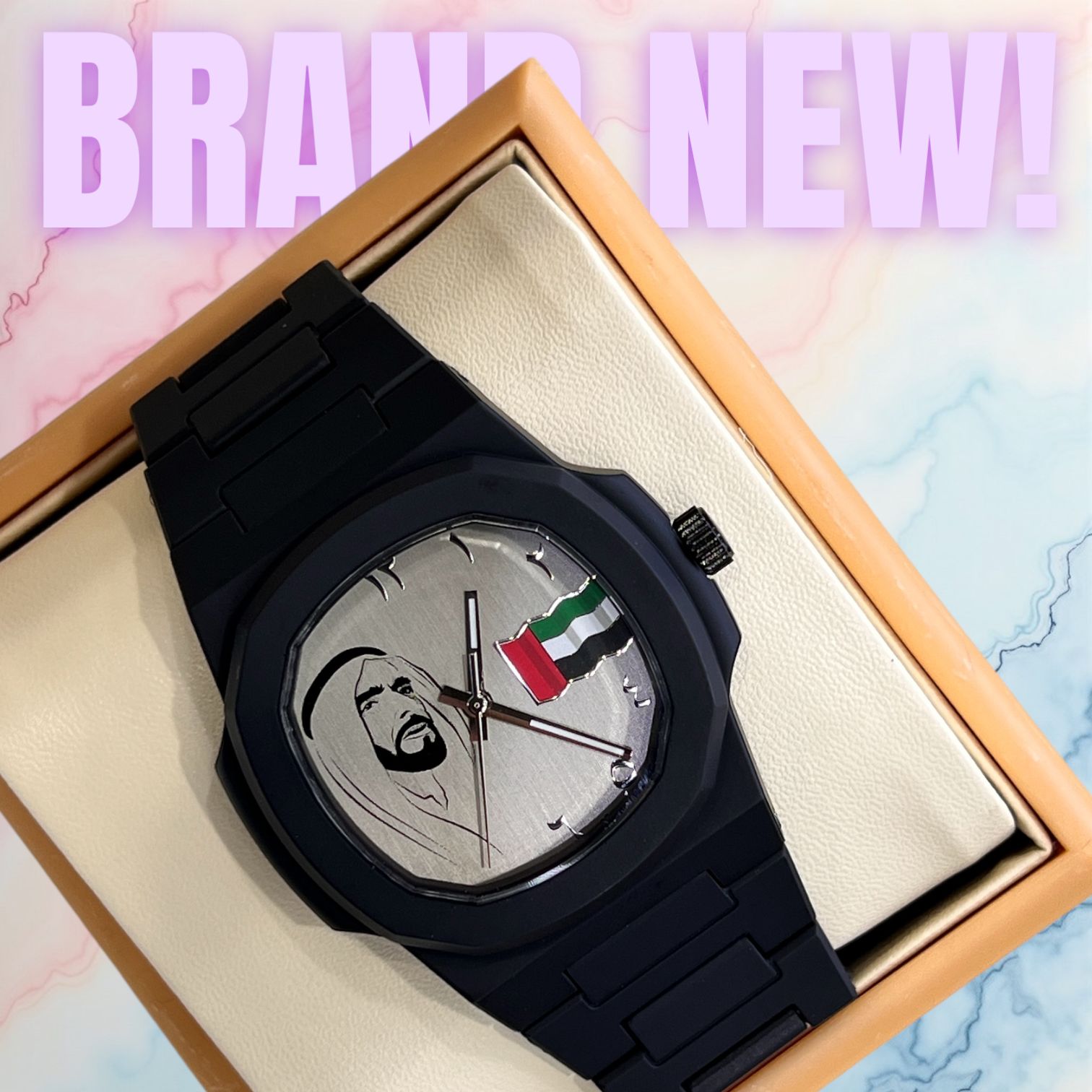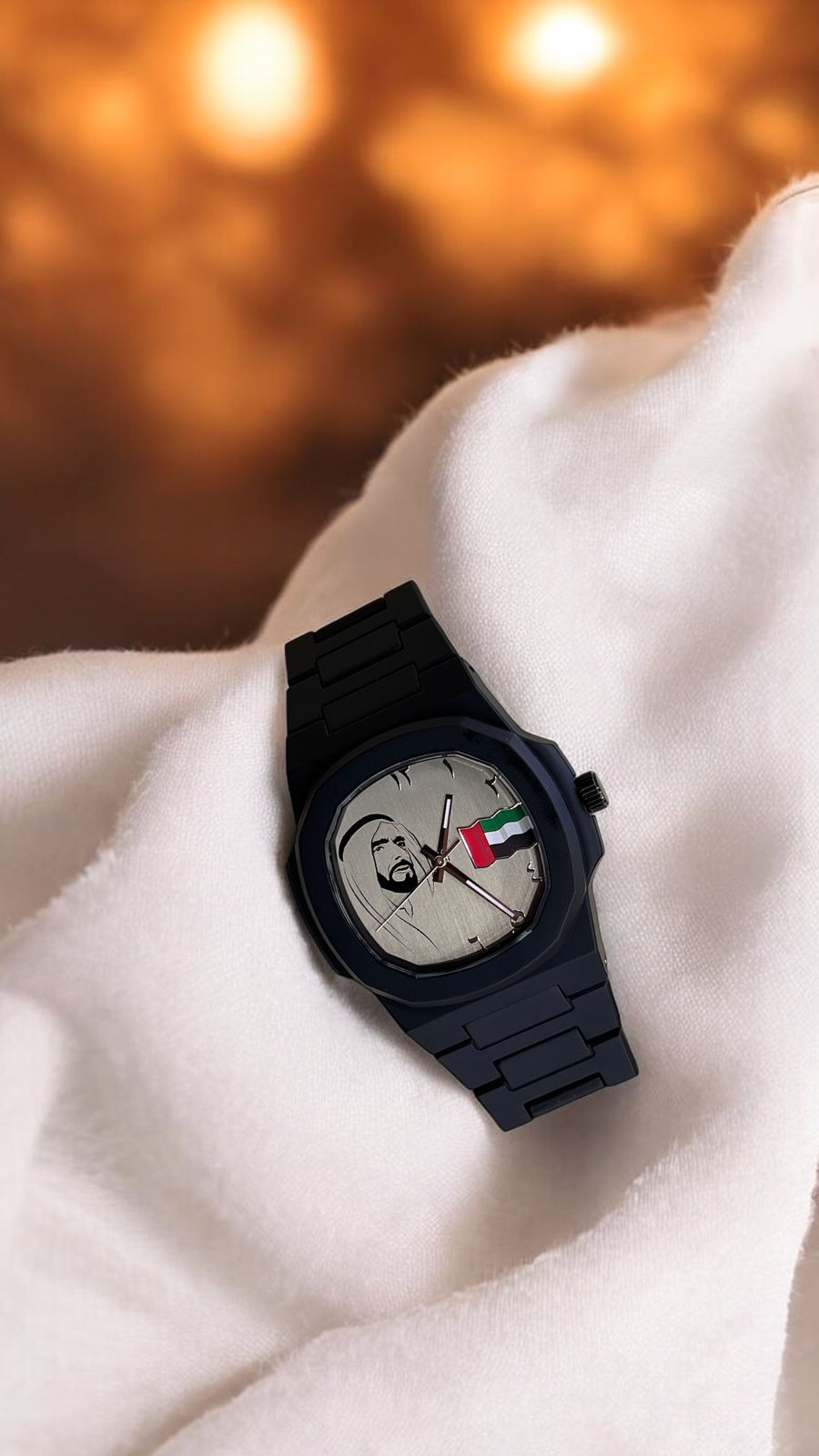 Honor Emirati heritage with this prestigious UAE Flag Sheikh Watch. The sophisticated grey dial showcases elegant Arabic numerals alongside a distinguished Sheikh portrait, symbolizing national pride and leadership. Complemented by a premium black chain band, this distinguished timepiece offers both refinement and cultural significance. Perfect for special occasions or everyday wear, this watch allows gentlemen to carry a piece of UAE's noble legacy wherever they go. A truly remarkable accessory for the patriotic connoisseur.