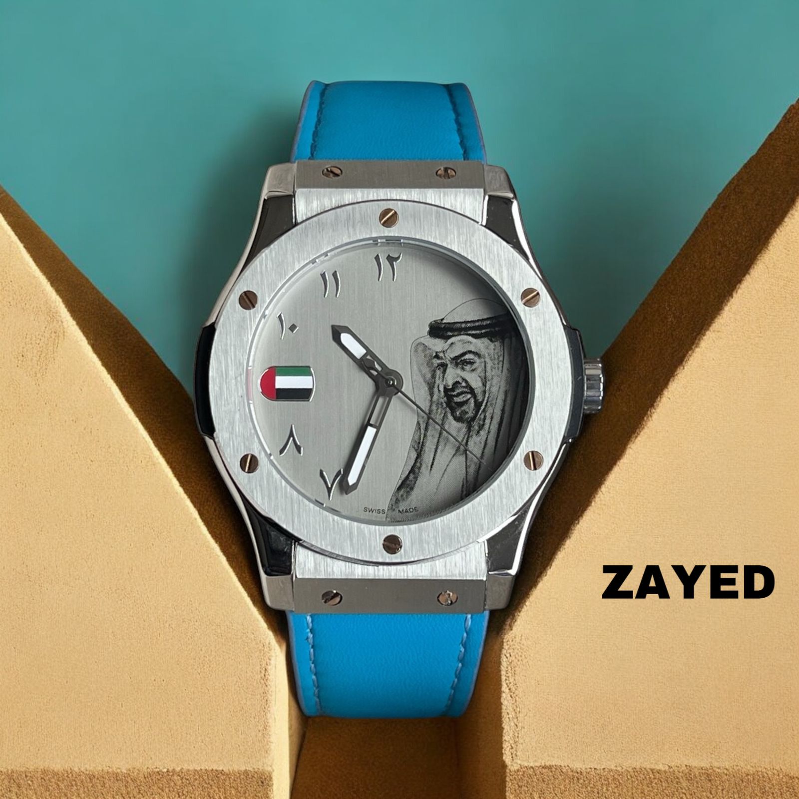 Celebrate your love for UAE with this Zayed gift watch. It features a beautiful Arabic dial and a sky blue strap adorned with the UAE flag. Show your pride and style with this unique timepiece. Perfect as a gift for yourself or your loved ones.