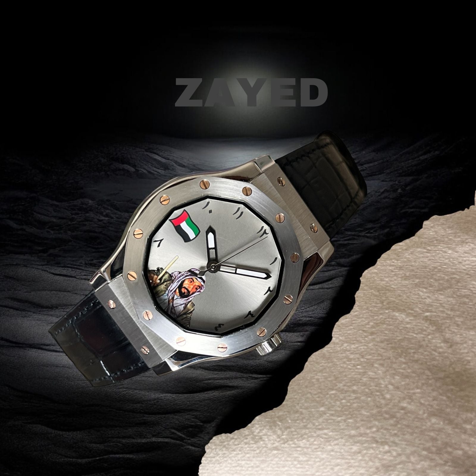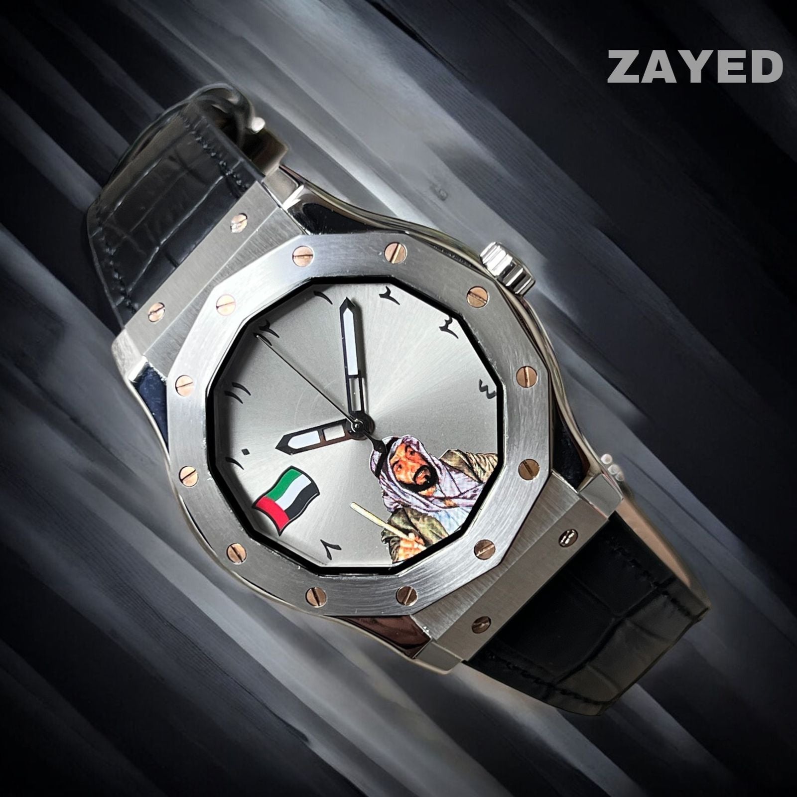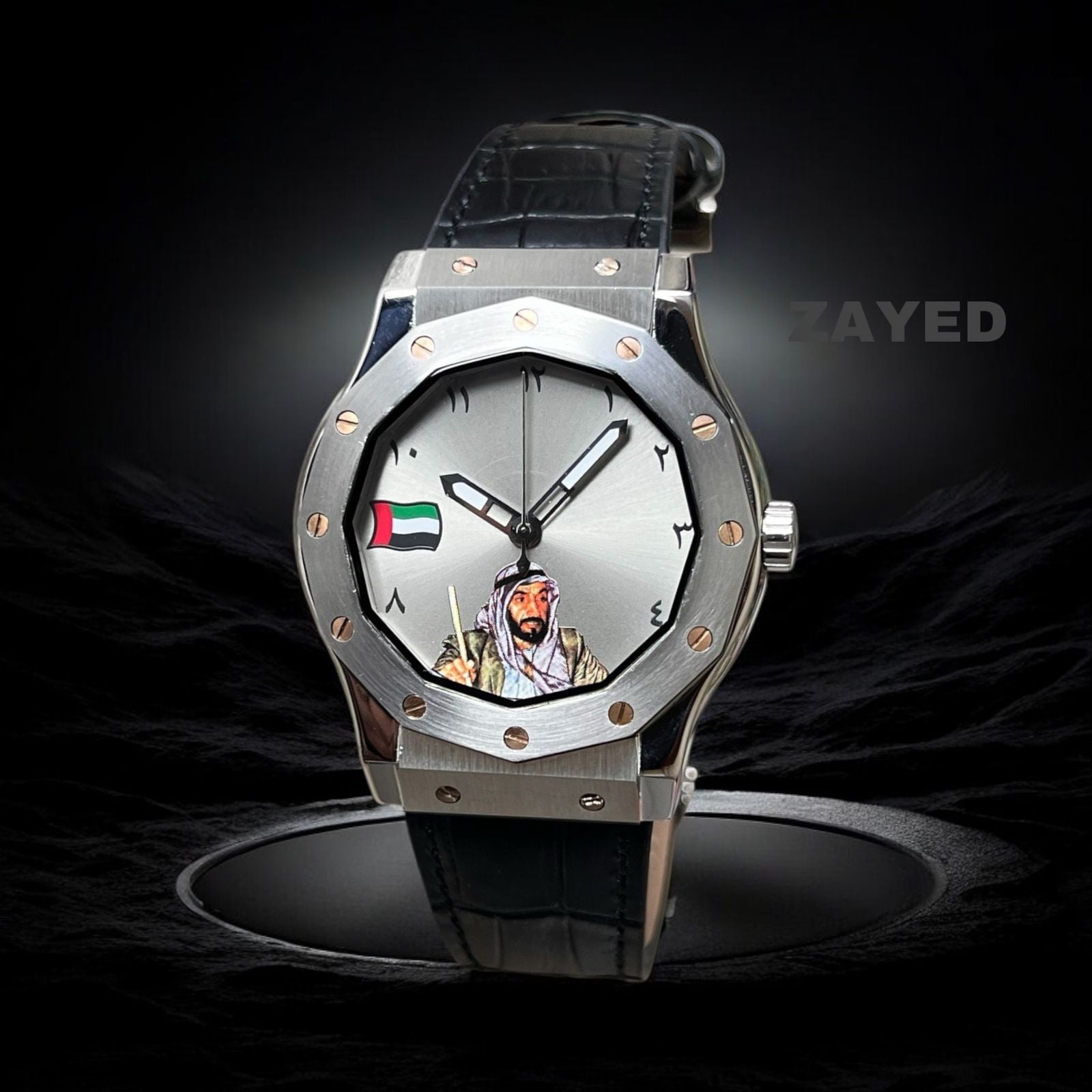 Show your UAE pride with this stylish watch featuring the UAE flag and Zayed's signature. The Arabic dial and black leather strap add a touch of sophistication. Wear it proudly and embody the spirit of unity and progress.