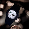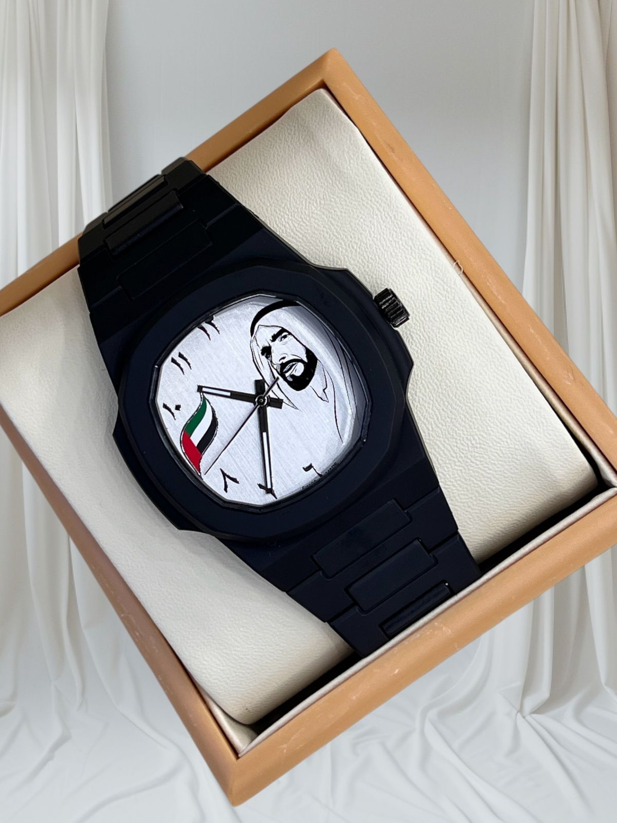 Showcase your national pride with this elegant UAE Sheikh Flag timepiece. Featuring an exquisite Arabic silver dial adorned with the revered Sheikh's image and UAE flag, this sophisticated gents watch is complemented by a sleek black chain bracelet. Perfect for patriotic occasions or everyday wear, this distinctive timepiece combines cultural heritage with modern style for the distinguished Emirati gentleman.