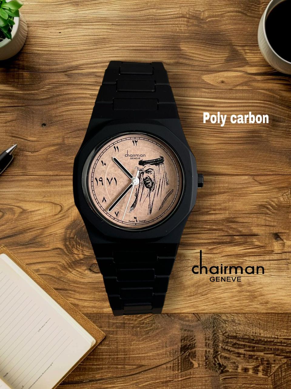 UAE Sheikh Photo Year Arabic Beige Dial Black Chairman Geneve Gents Poly Carbon Watch