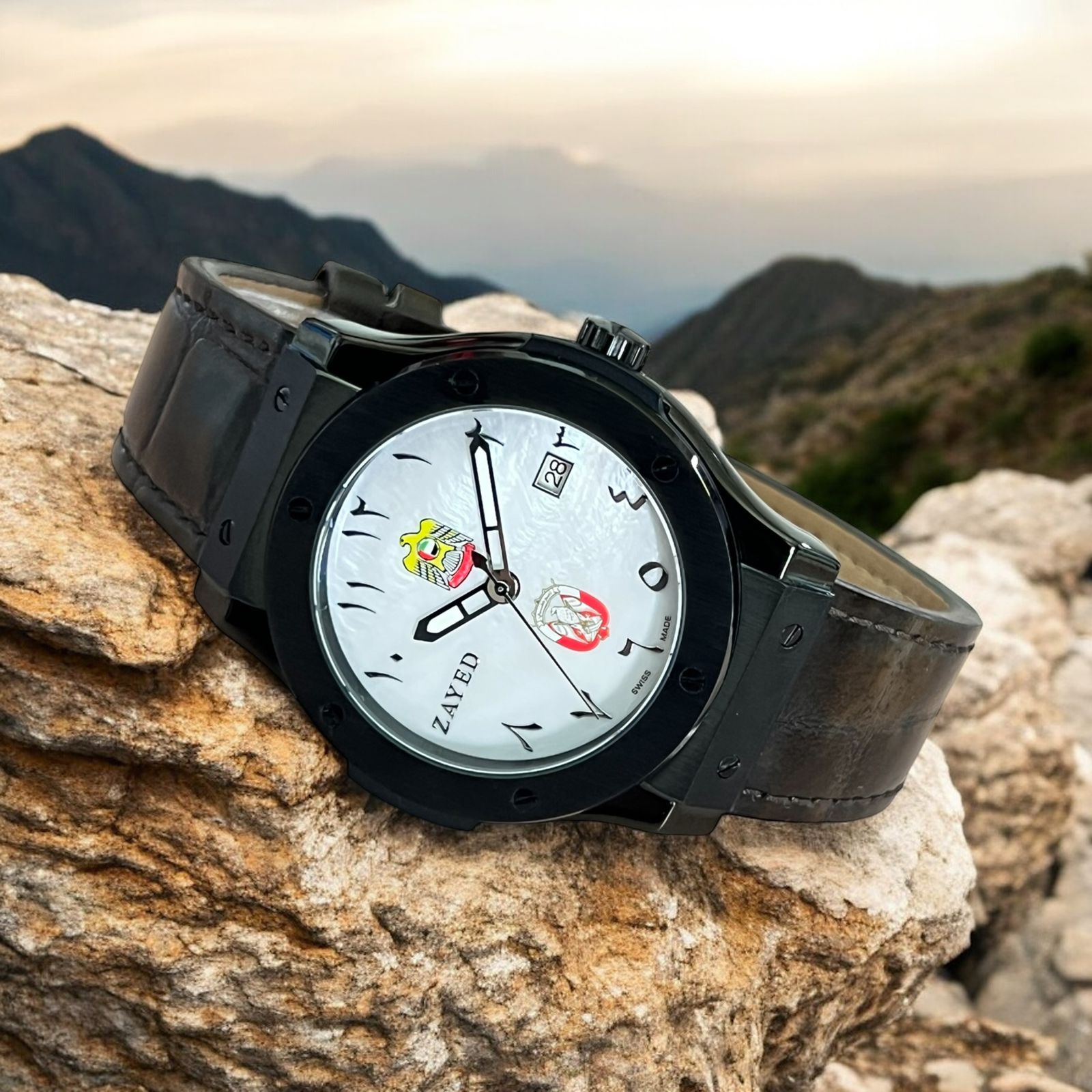 Celebrate heritage and style with this Gents Watch featuring the iconic Zayed UAE and Abu Dhabi emblem. The crisp white dial with Arabic date display offers clear readability, while the rich brown strap adds timeless sophistication. Perfect for those who value tradition and elegance in their everyday accessories.