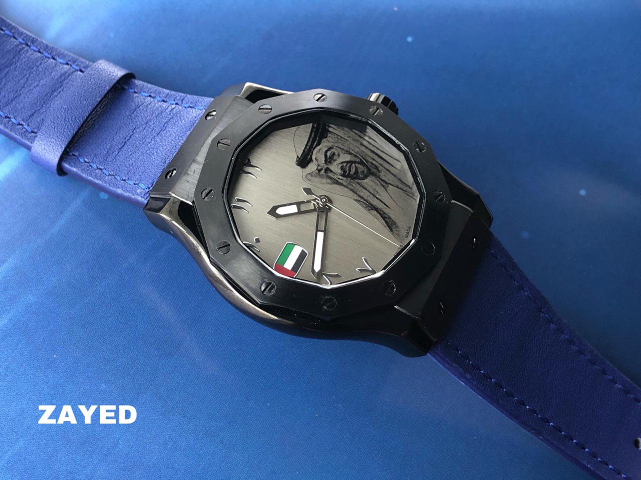 Introducing the Zayed UAE Flag Blue Strap Metallic Dial Men's Watch, a masterpiece of Swiss watchmaking that embodies the elegance and luxury of the UAE. With its stunning blue strap and metallic dial, this timepiece is a statement of style and sophistication, perfect for the discerning gentleman who appreciates the finer things in life.