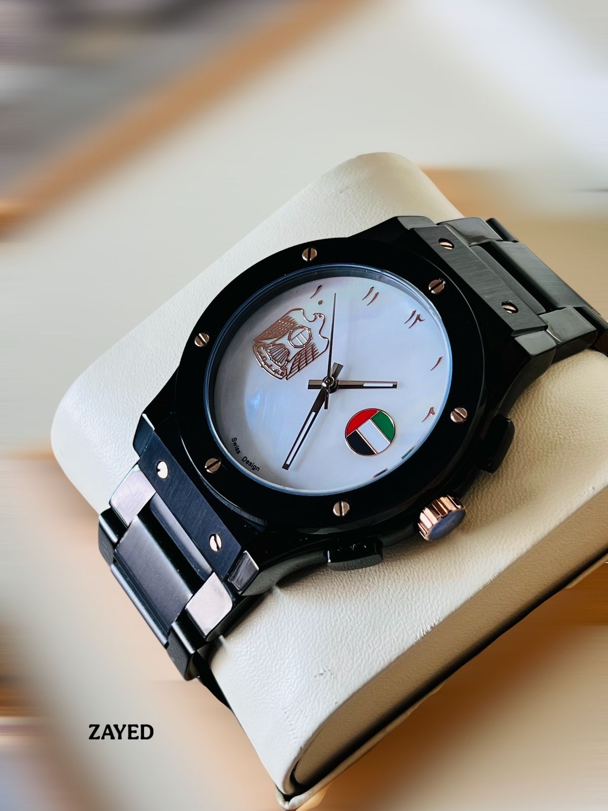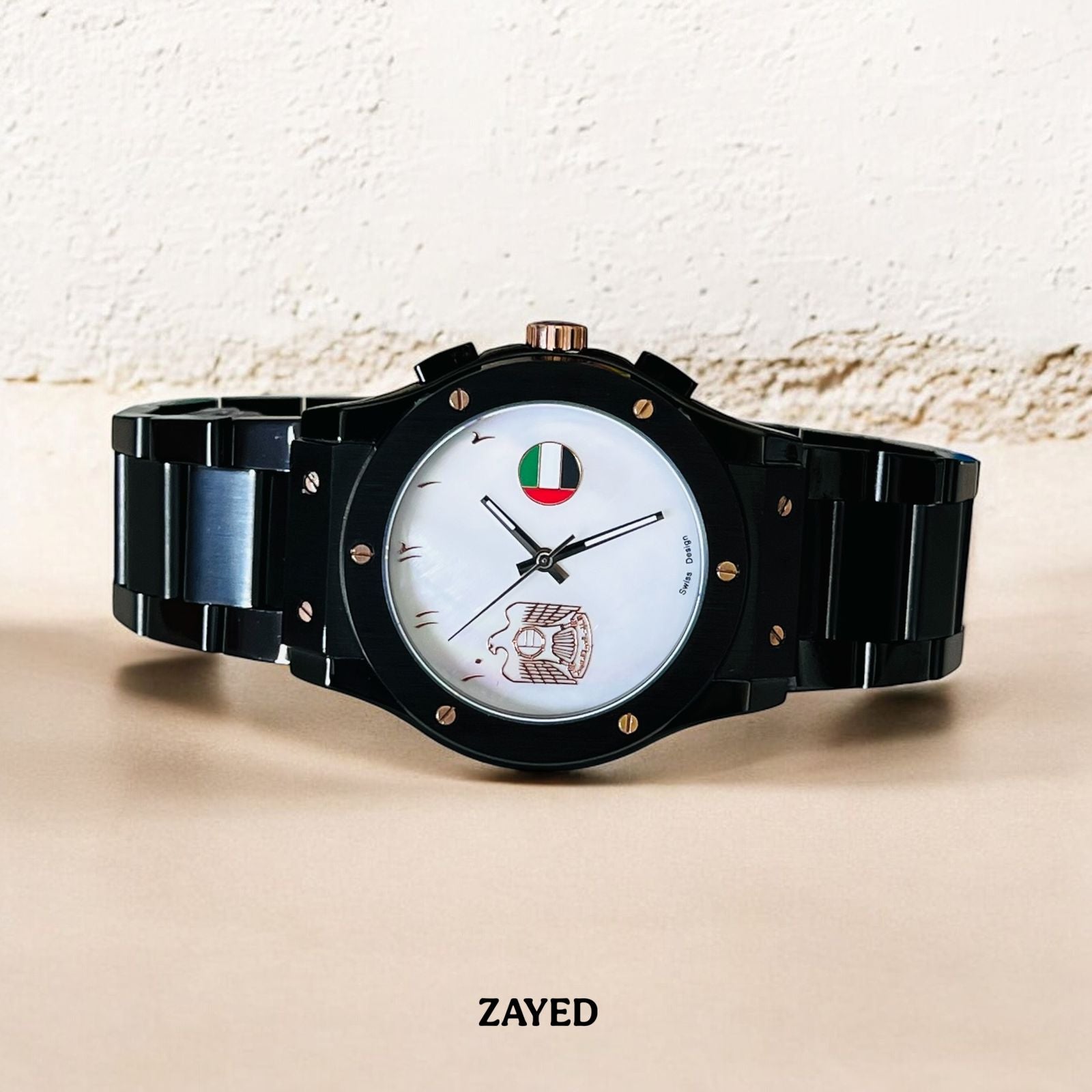 Celebrate Emirati pride with this distinguished timepiece featuring the iconic Zayed UAE flag emblem. The elegant white dial showcases Arabic numerals, blending traditional heritage with contemporary design. Crafted with a sleek black chain strap, this gents watch delivers both sophistication and patriotic flair. Perfect for those who value cultural significance and refined style, it makes an exceptional gift or personal statement piece. Ideal for everyday wear or special occasions, this watch honors the legacy of the UAE while keeping you punctually connected.